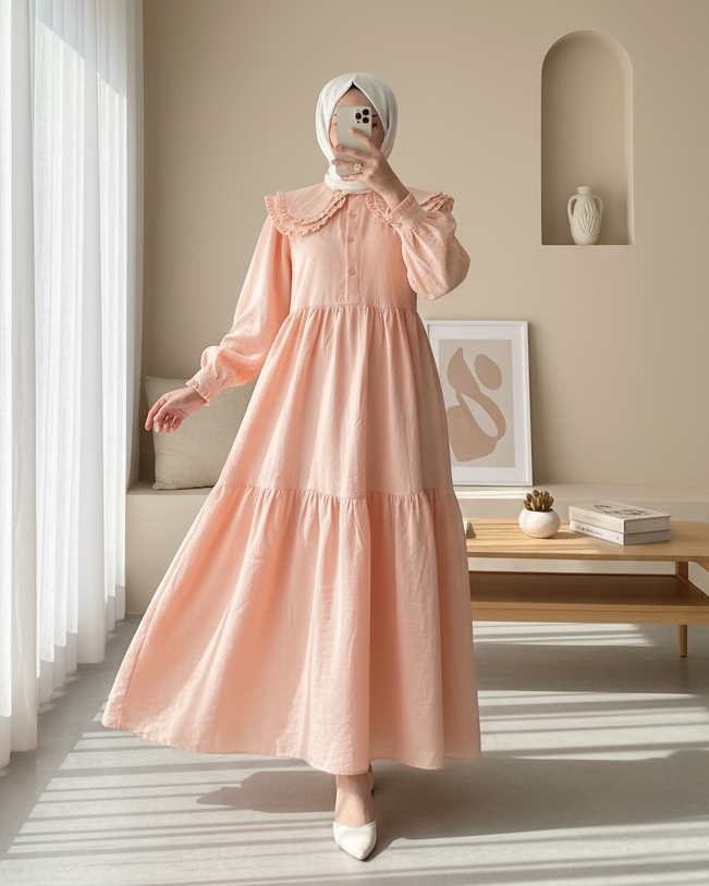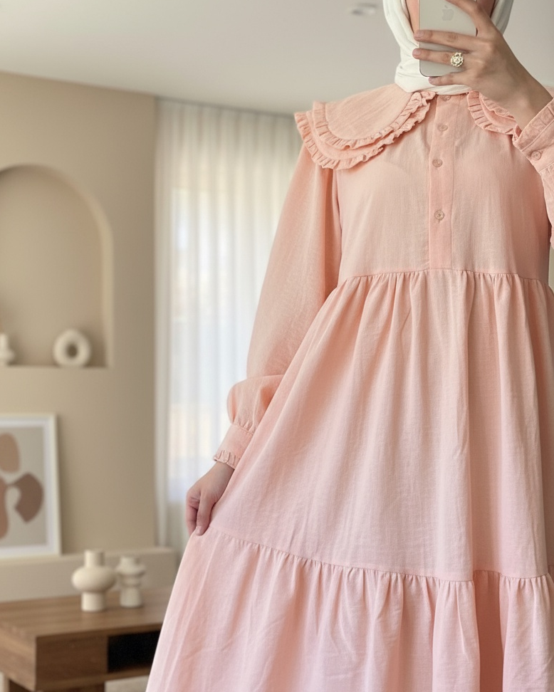 Bebe Yaka Fırfırlı Parçalı İthal Keten Elbise -Yavruağzı-Yavruağzı