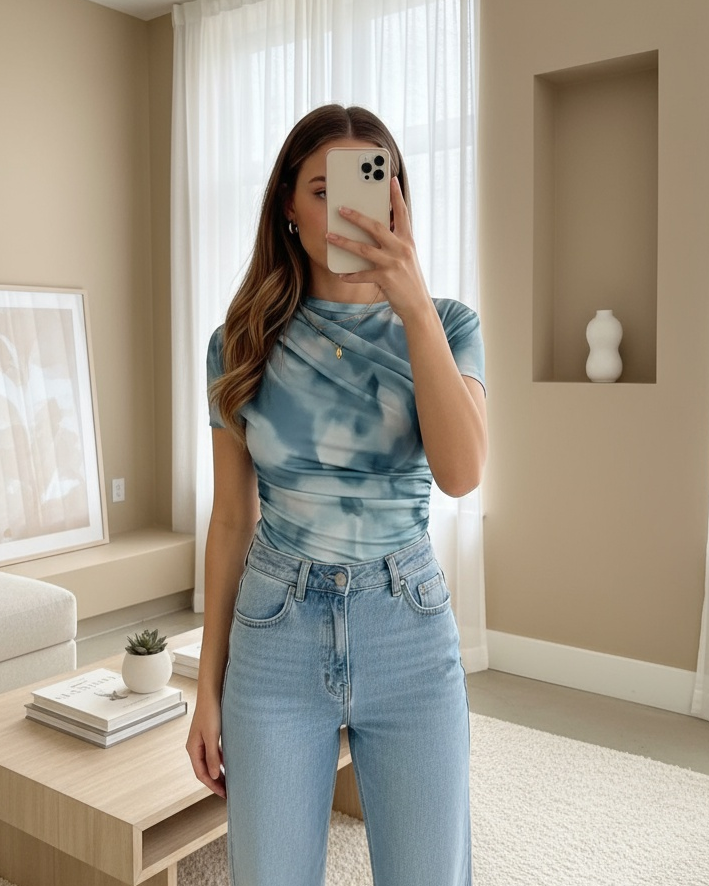 Bel Omuz Büzgülü Batik Baskı Sendy Bluz -Açık Mavi-Açık Mavi