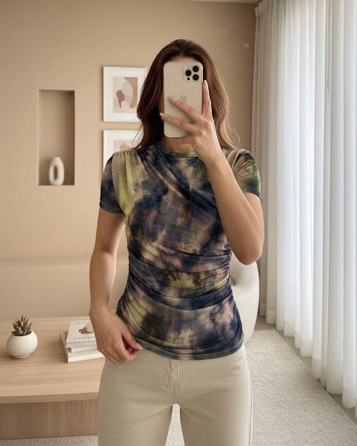Bel Omuz Büzgülü Batik Baskı Sendy Bluz -Yeşil-Yeşil