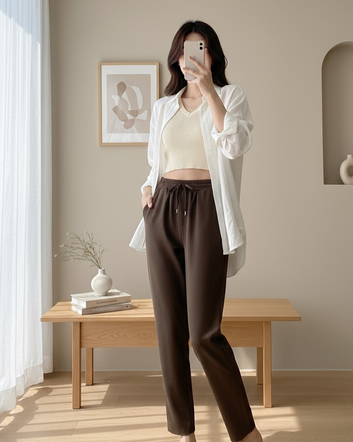 Beli Bağcıklı Dar Paça Pantolon -Kahve-Kahve