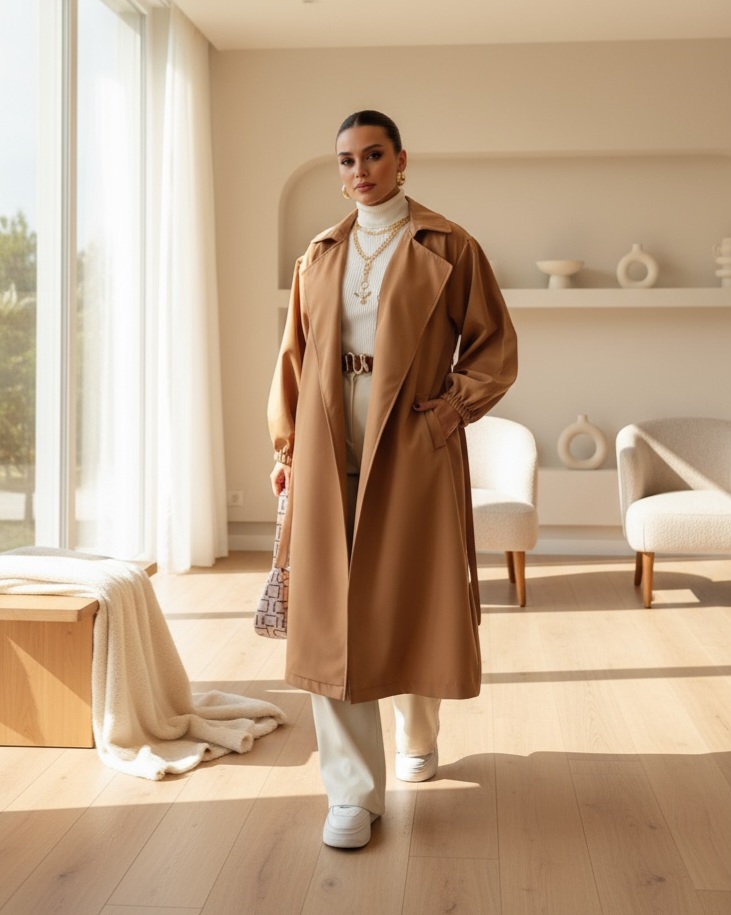 Beli Bağcıklı Kolu Lastikli Tesettür Trenckot -Vizon-Vizon