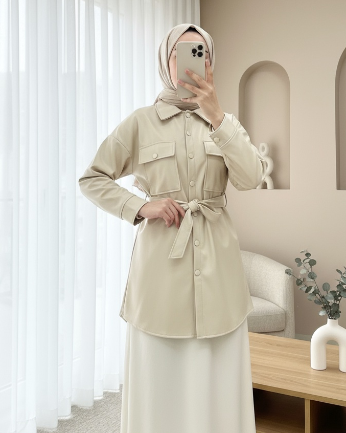 Beli Bağlamalı Çift Cepli Deri Gömlek -Krem-Krem