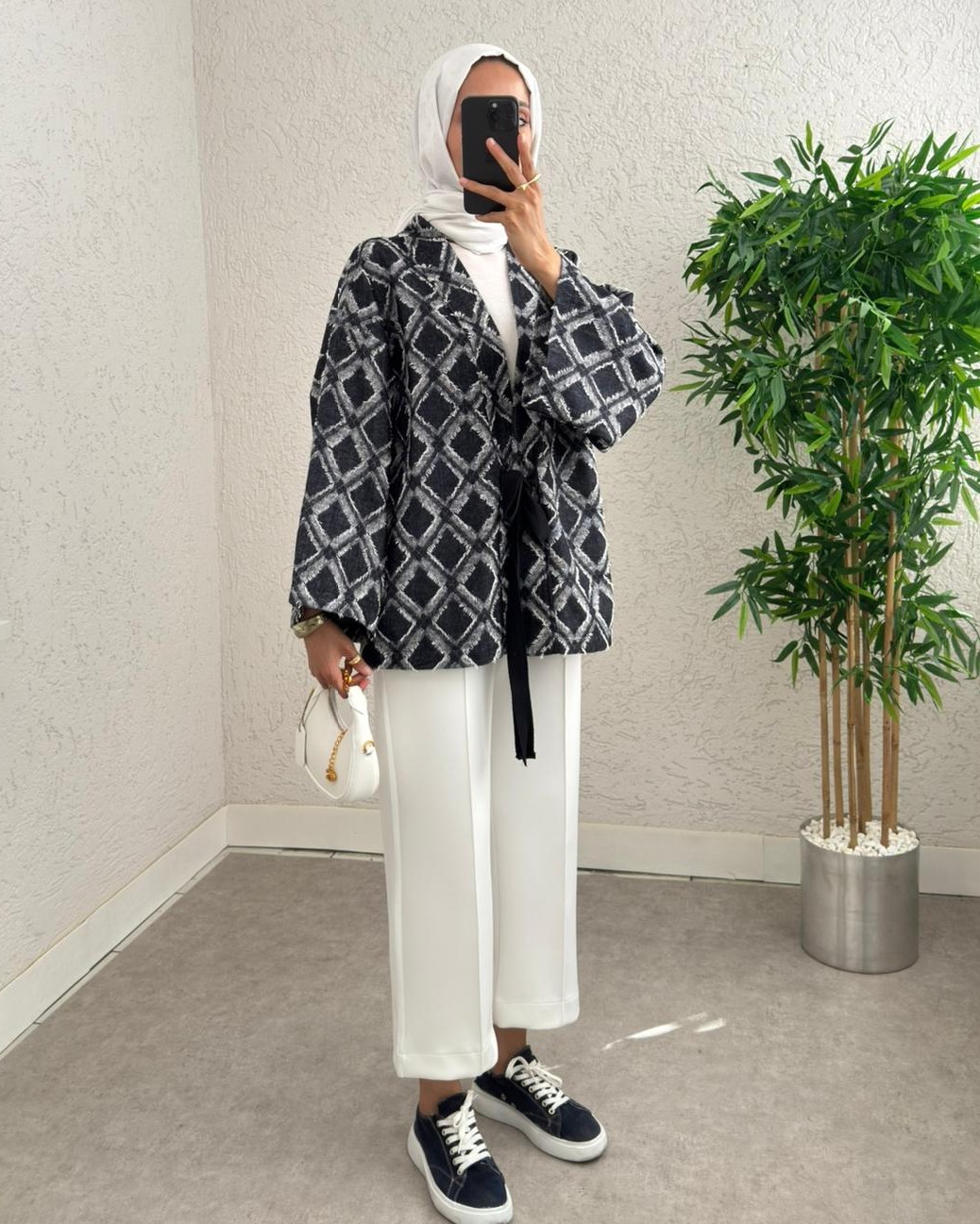 Beli Bağlamalı Kare Desen Saçaklı Kimono -K.Laci-K.Laci
