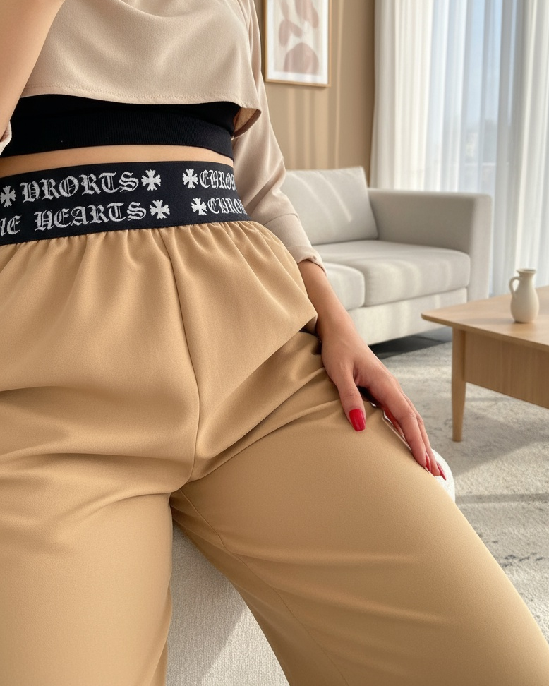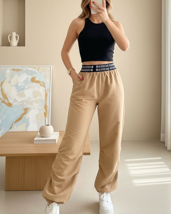 Beli Bantlı Paçası Lastikli Pantolon -Vizon-Vizon