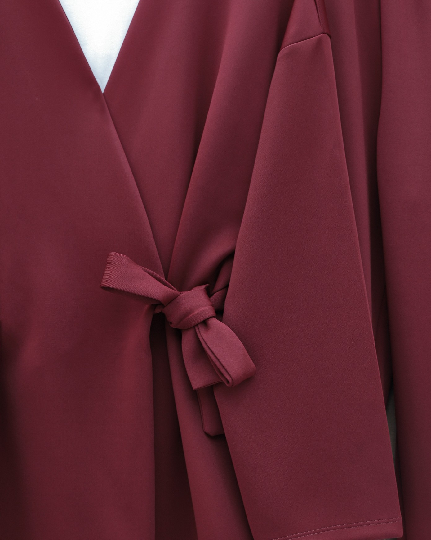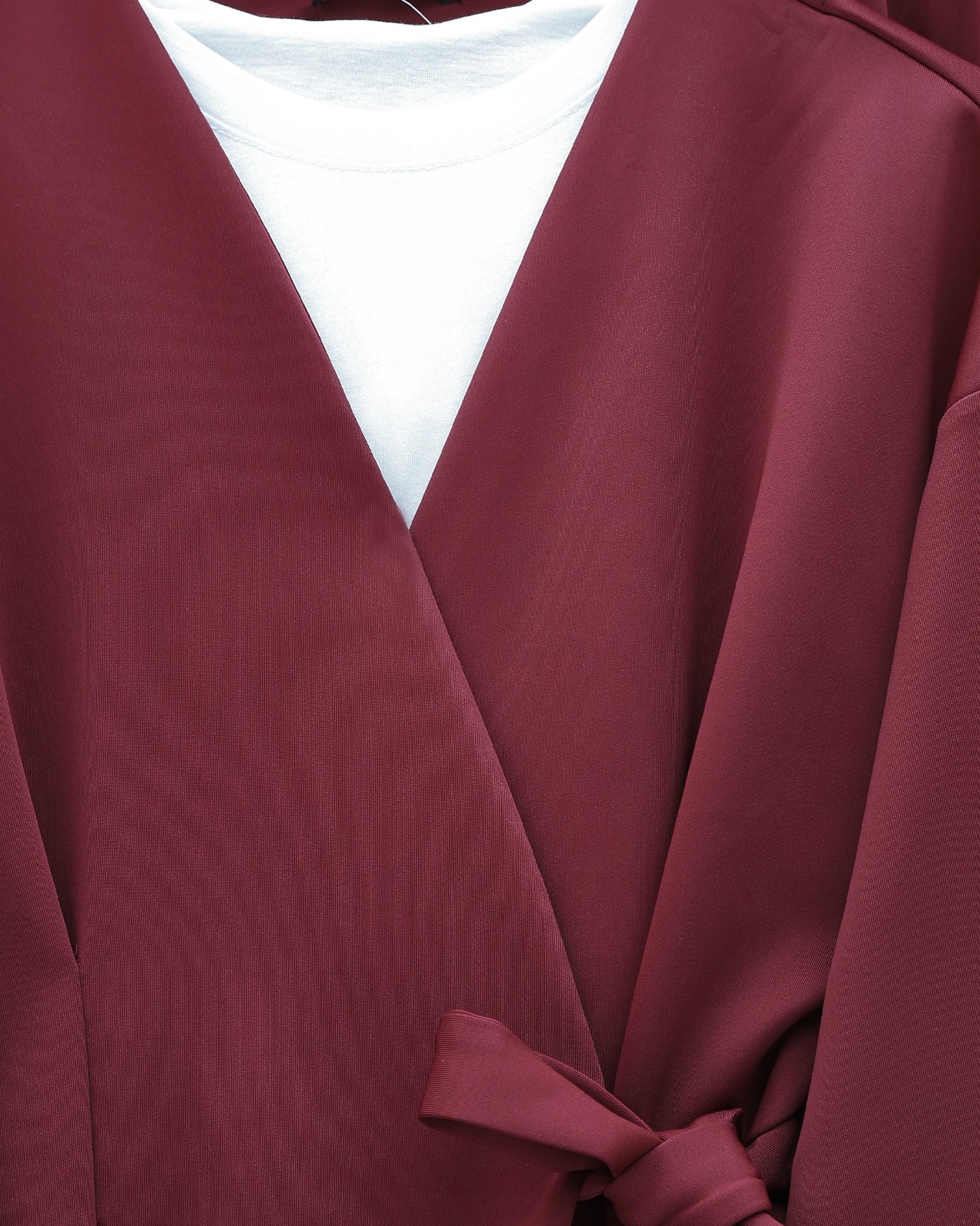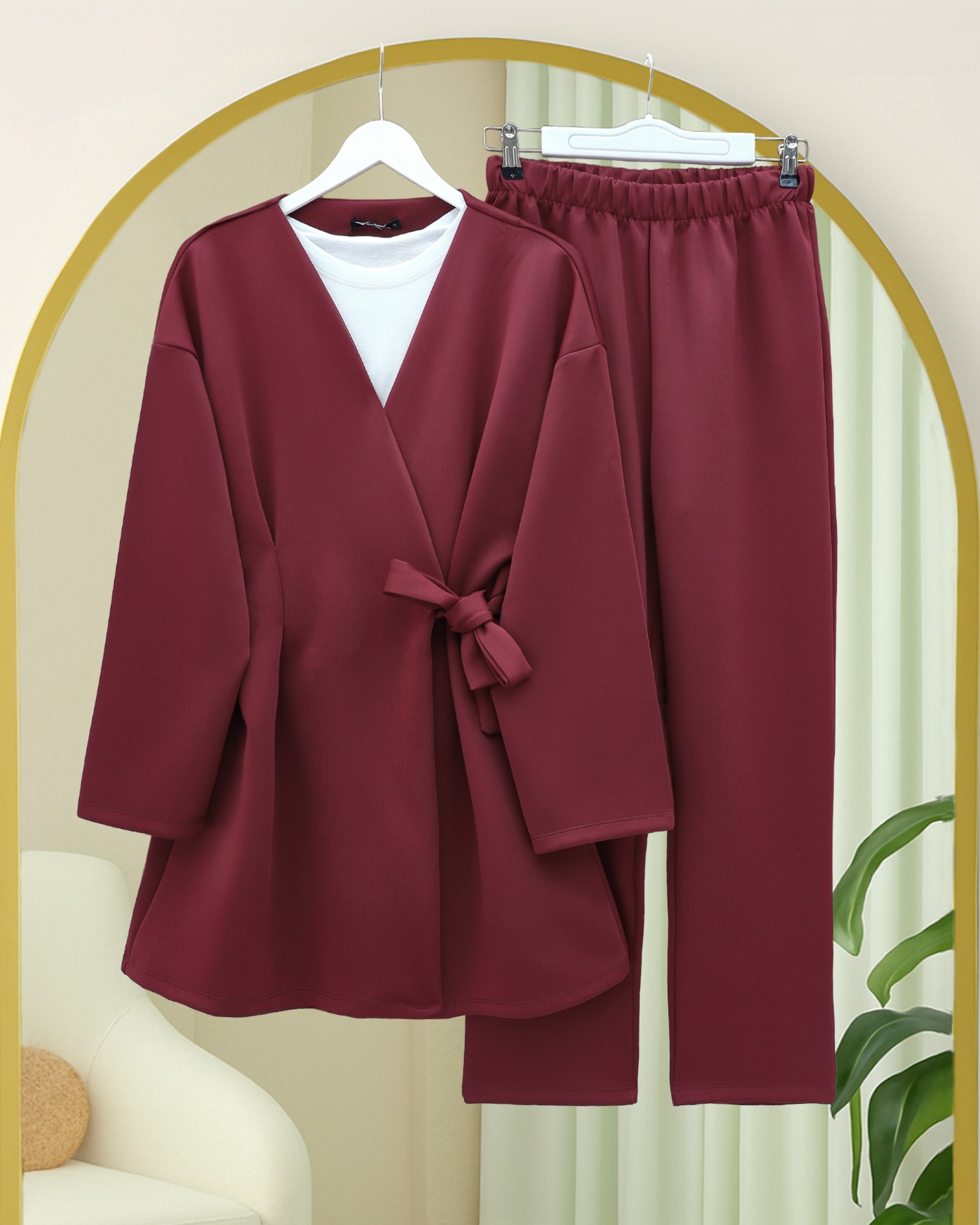 Beli Çift Bağlamalı Scuba Kimono Takım -Bordo-Bordo