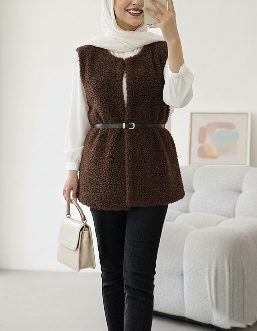 Beli Kemerli Çift Cepli Astarlı Peluş Yelek -Kahve-Kahve