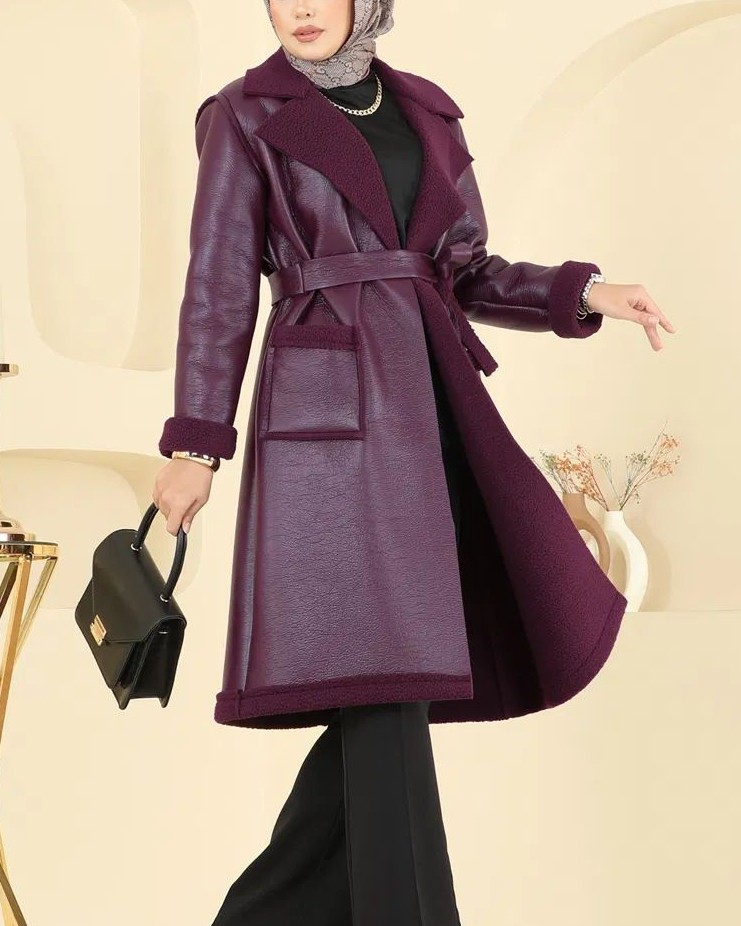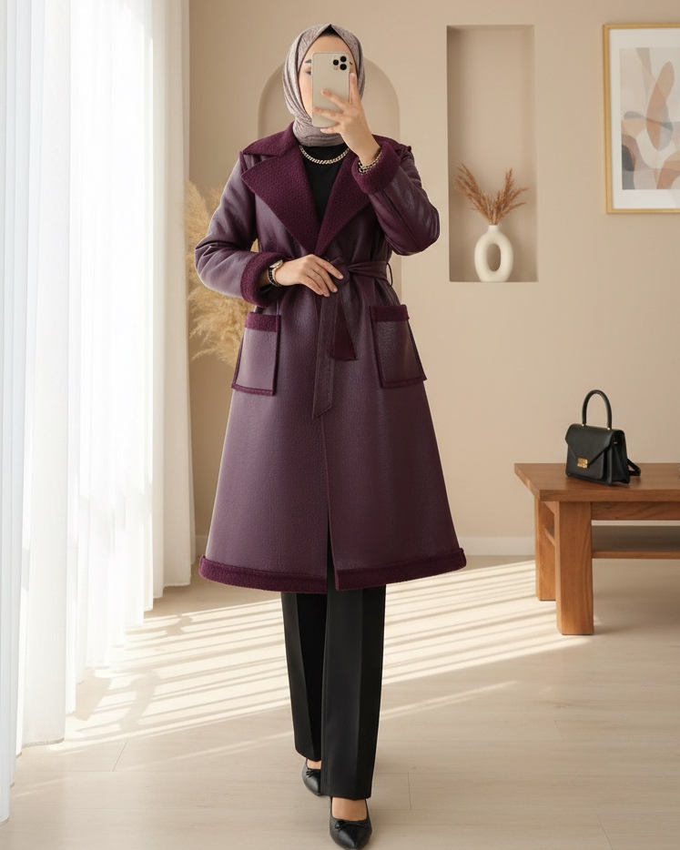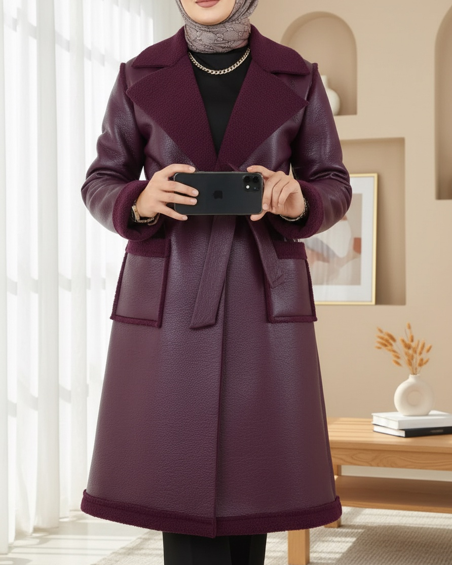 Beli Kemerli Çift Cepli İçi Kürklü Deri Kaban -Mürdüm-Mürdüm