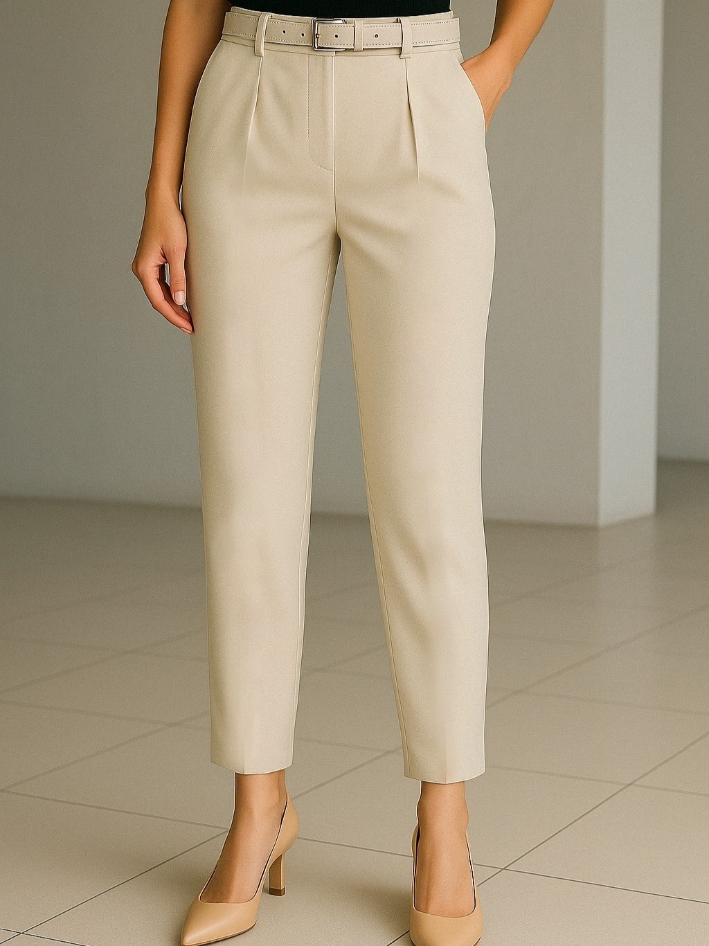 Beli Kemerli Çift Cepli Pantolon -Bej-Bej