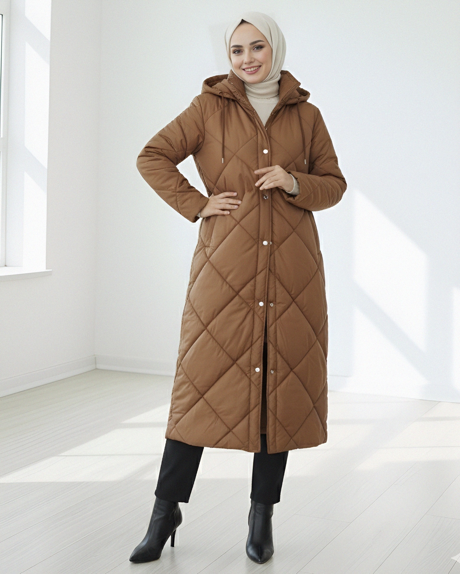 Beli Kemerli Önü Çıtçıtlı Kapşonlu Astarlı Uzun Kapitone Mont -Taba-Taba