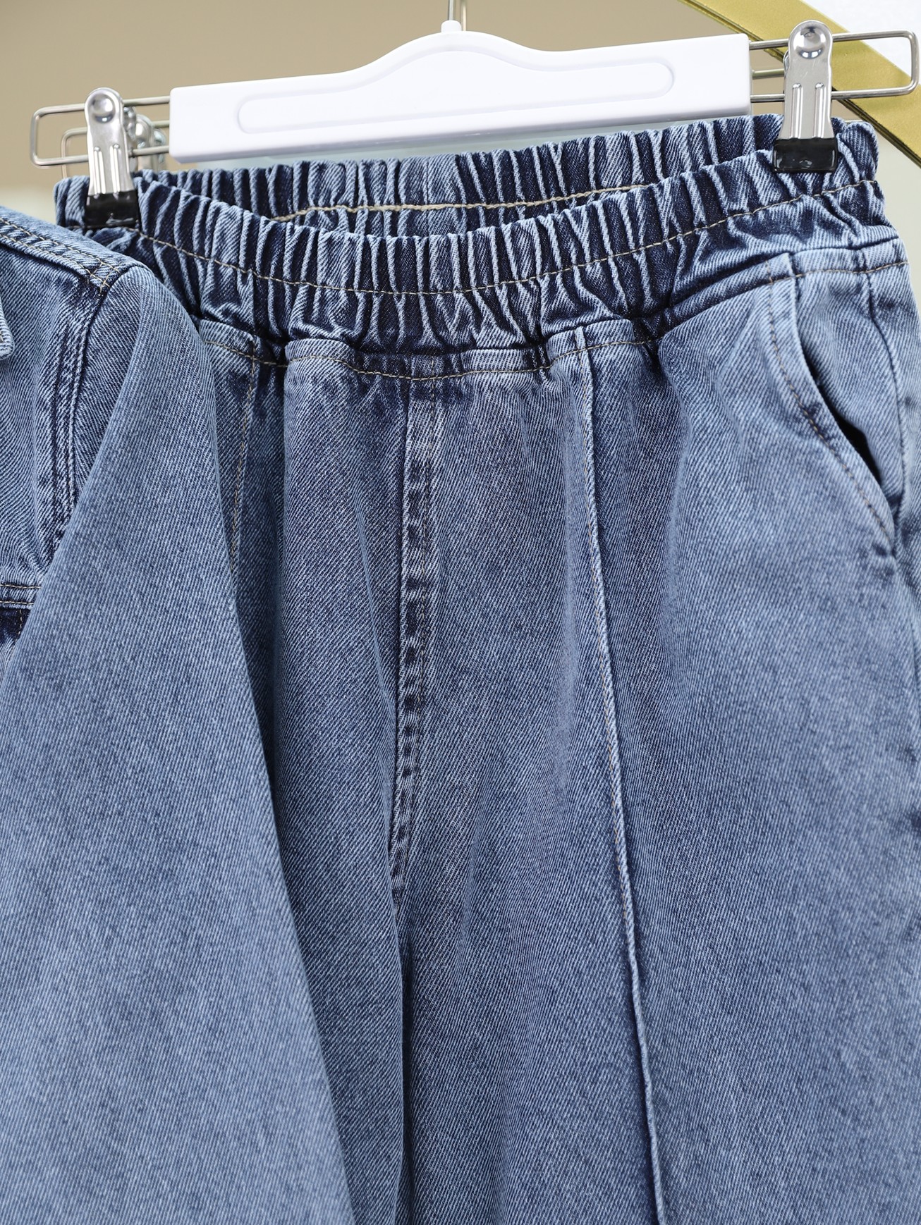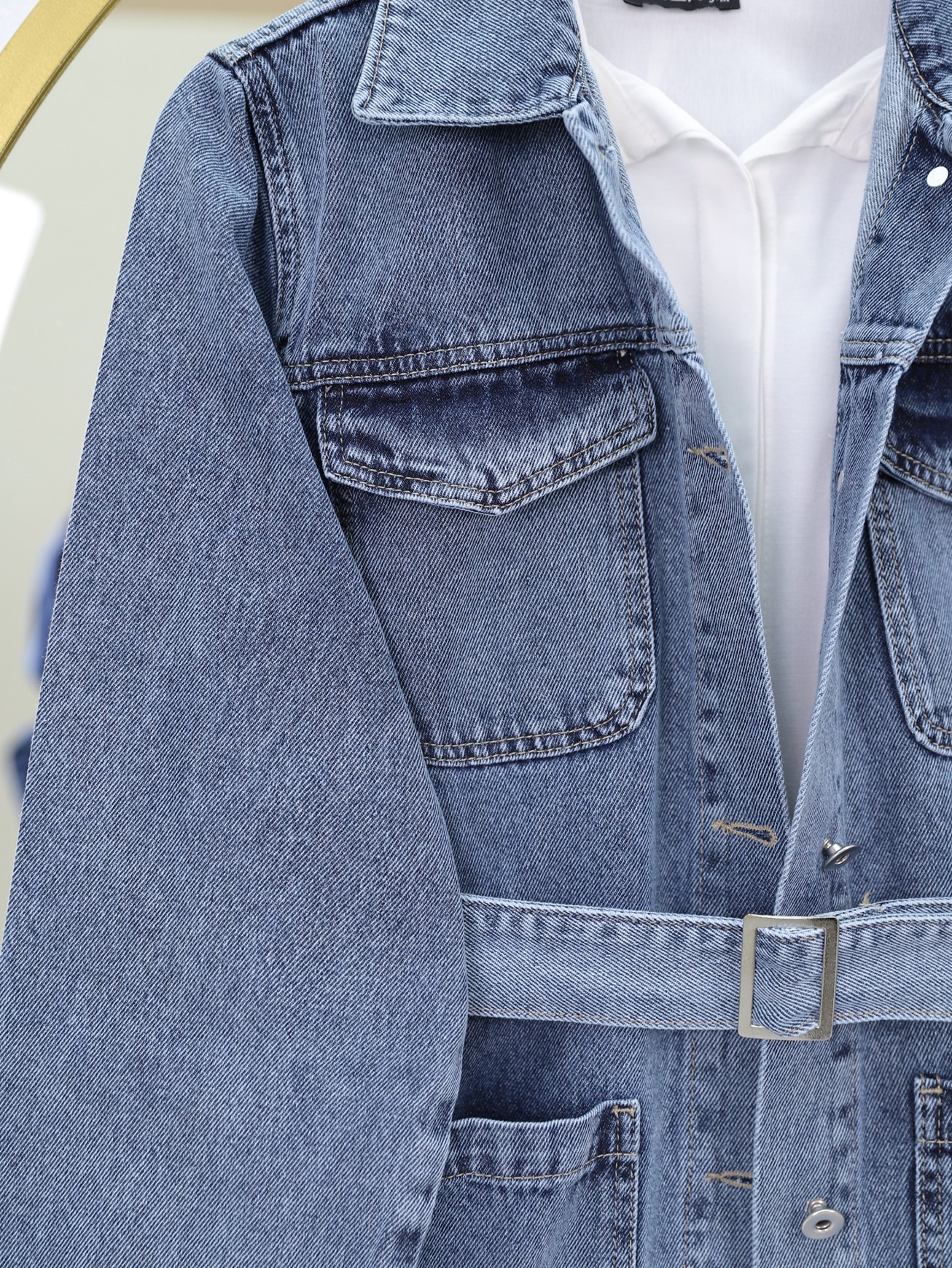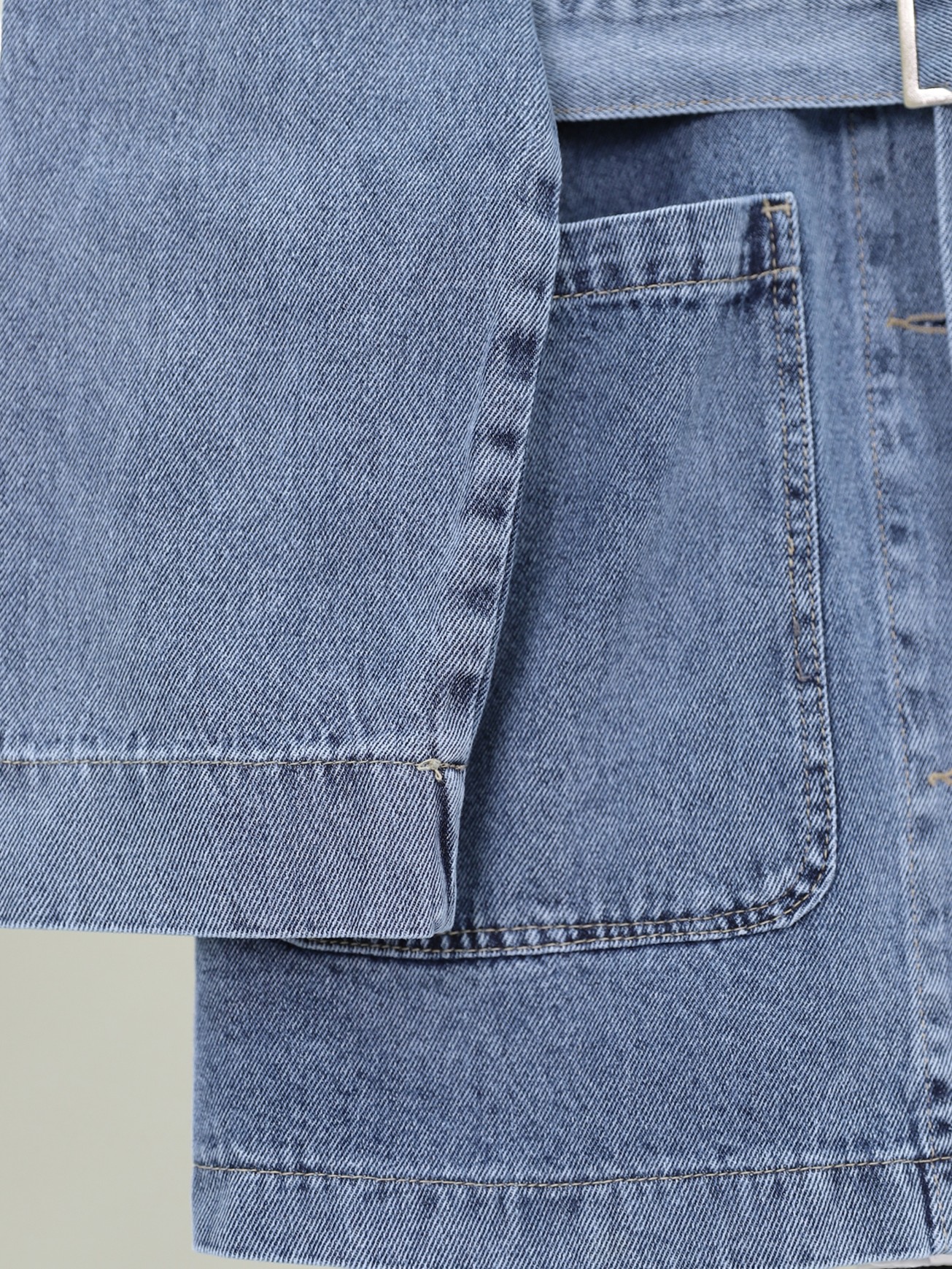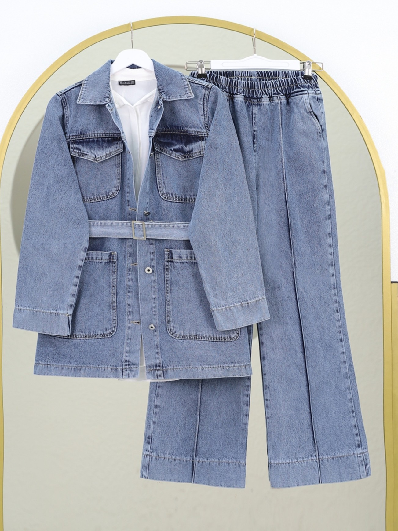 Beli Kemerli Önü Düğmeli Cepli Kot Takım -Buz Mavi-Buz Mavi