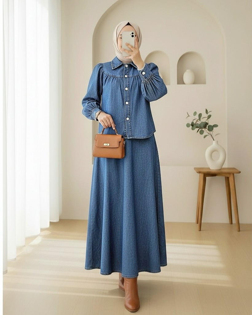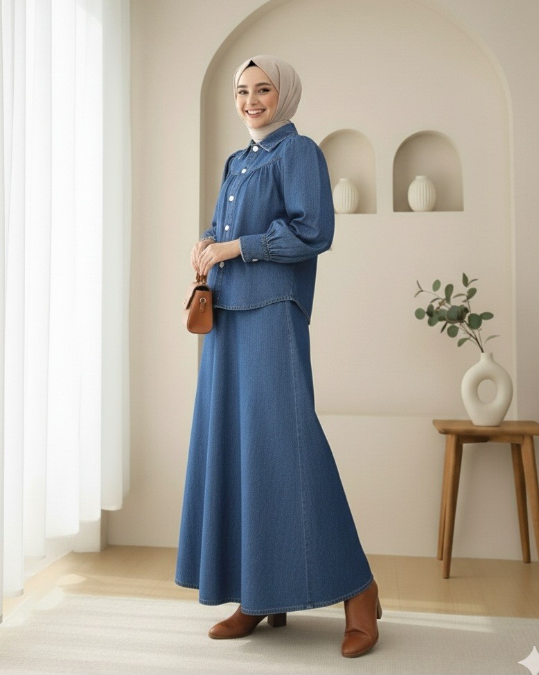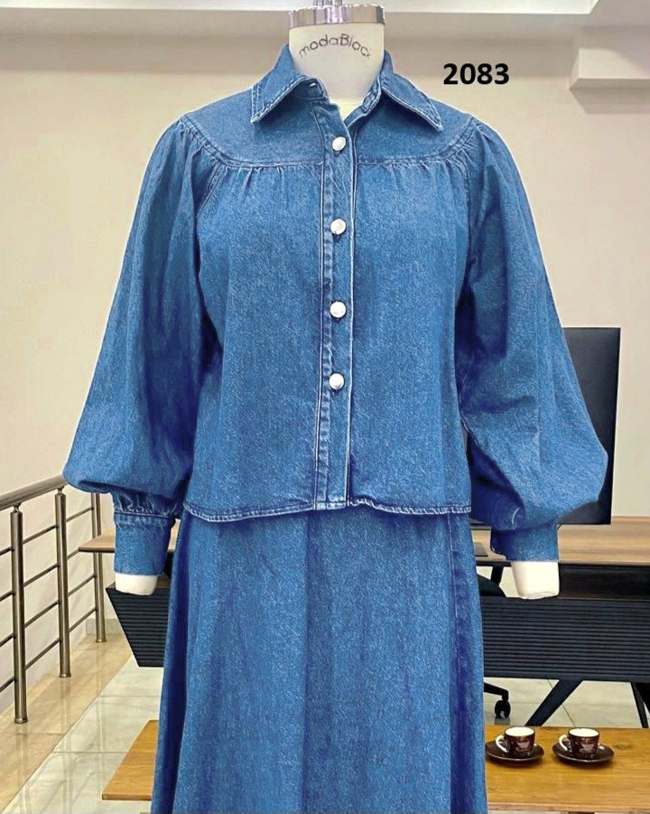 Beli Kemerli Önü Düğmeli Etekli Kot Takım -İndigo-İndigo