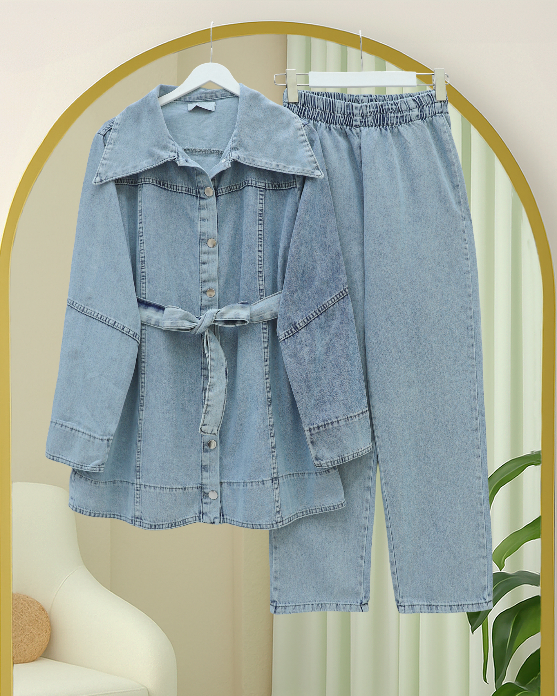 Beli Kemerli Önü Düğmeli Pantolonlu Kot Takım -Buz Mavi-Buz Mavi