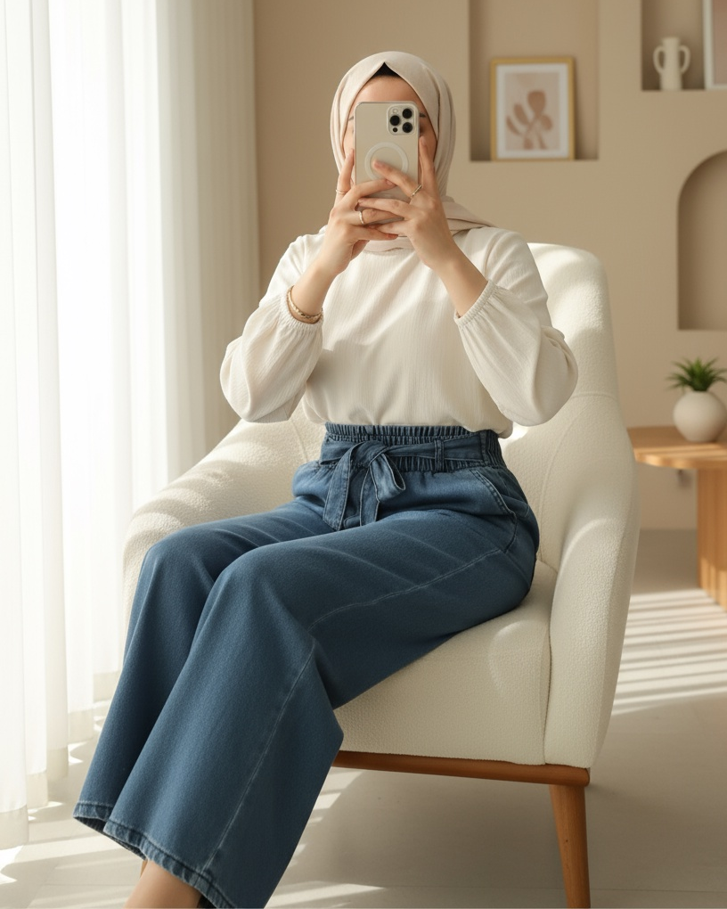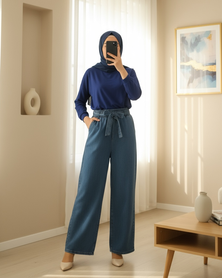 Beli Kuşaklı Lastikli Cepli Kot Pantolon -Laci-Lacivert
