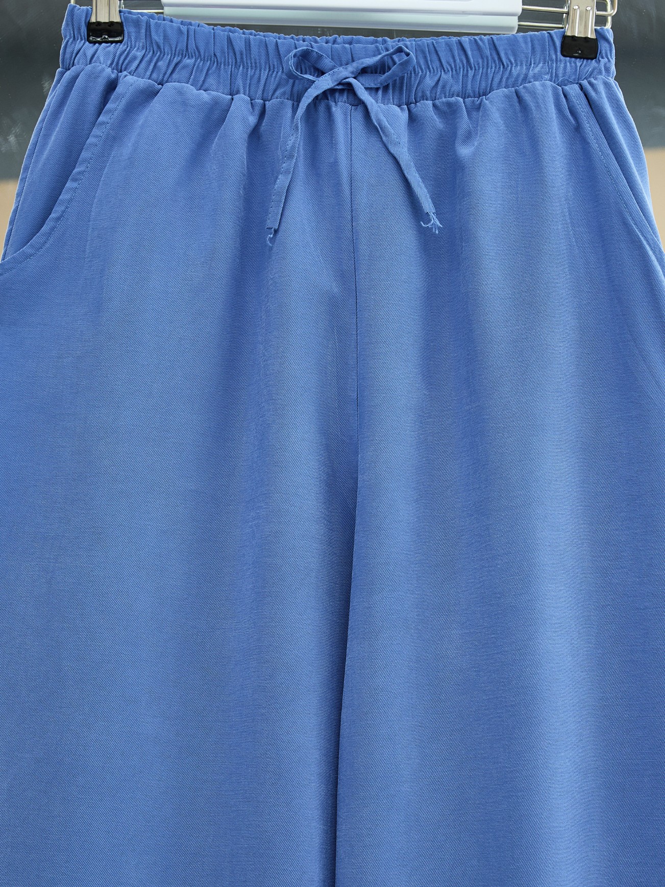 Beli Lastikli Bağcık Detaylı Cepli Bol Paça Tensel Pantolon -İndigo-İndigo