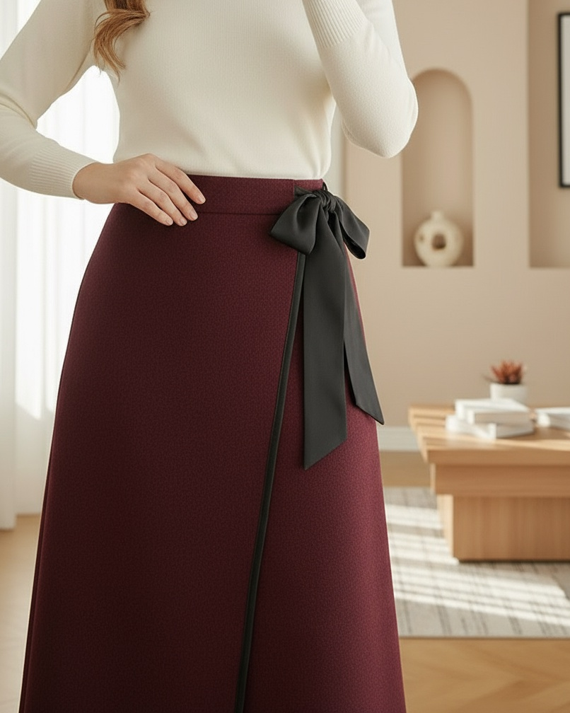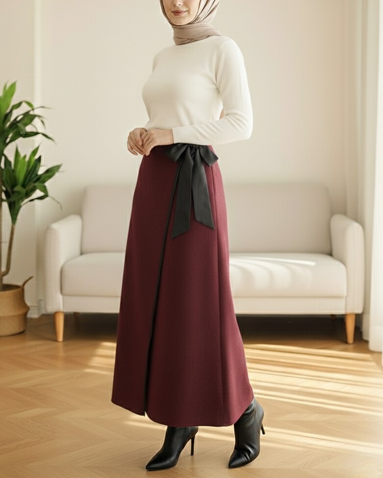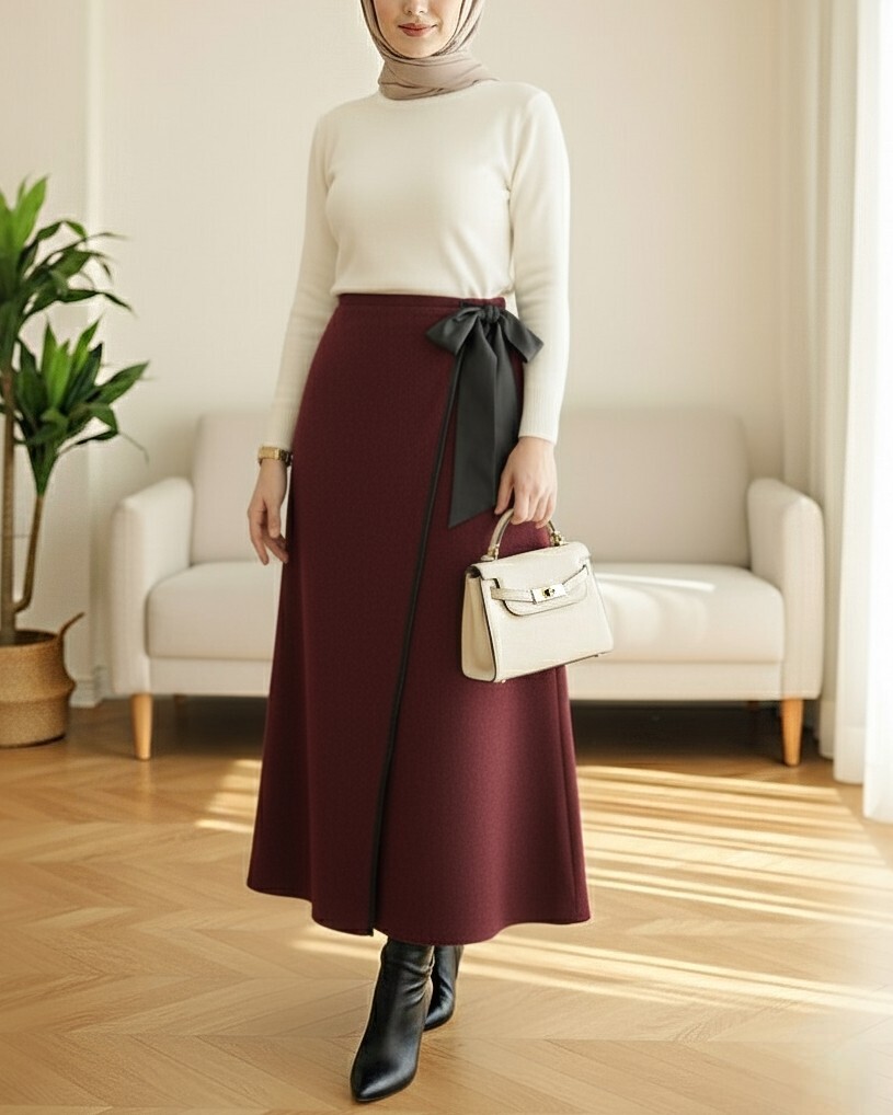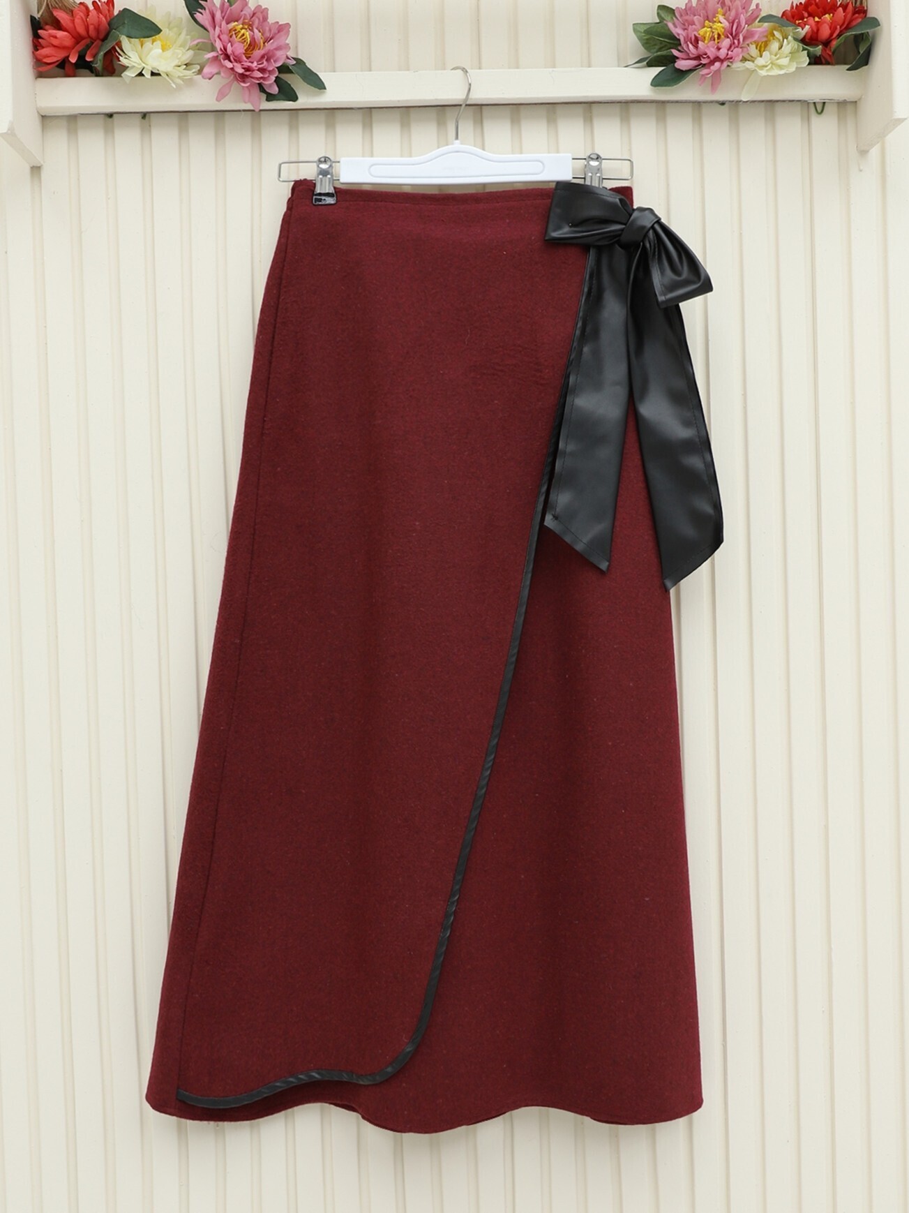 Beli Lastikli Bağlamalı Biyeli Kaşe Etek -Bordo-Bordo