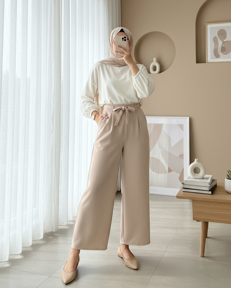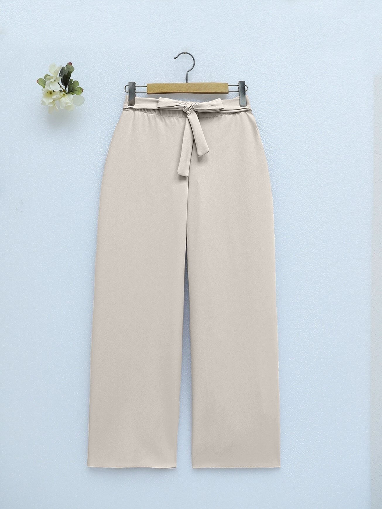 Beli Lastikli Bağlamalı Bol Paça Pantolon -Bej-Bej