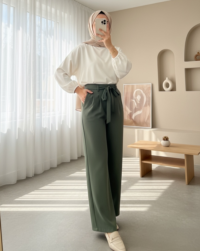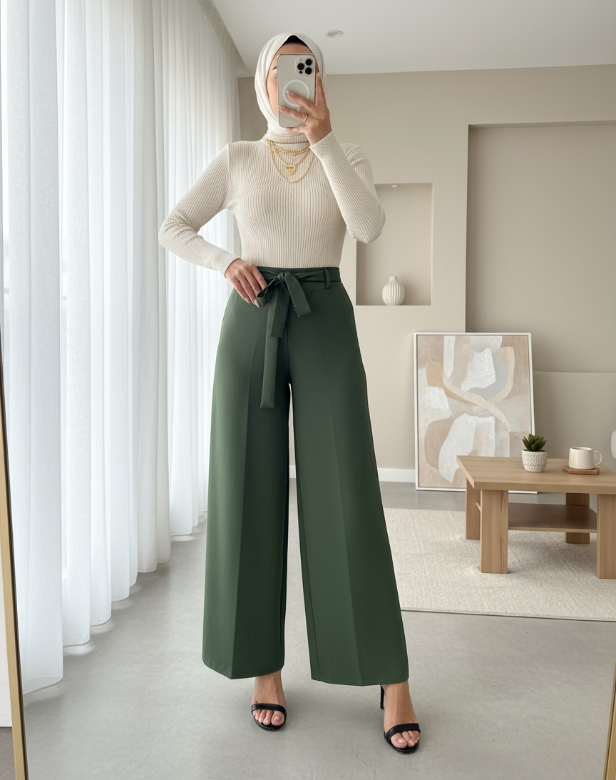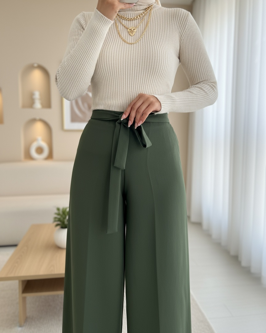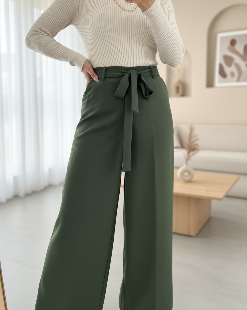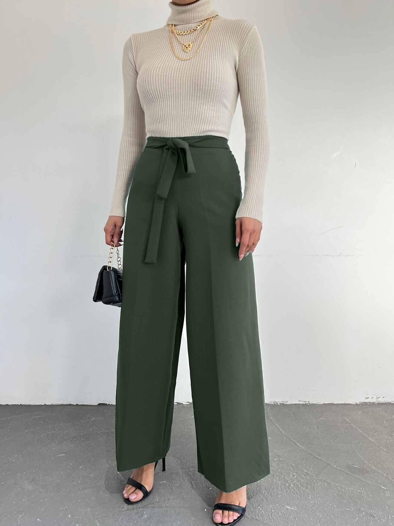 Beli Lastikli Bağlamalı Bol Paça Pantolon -Haki-Haki