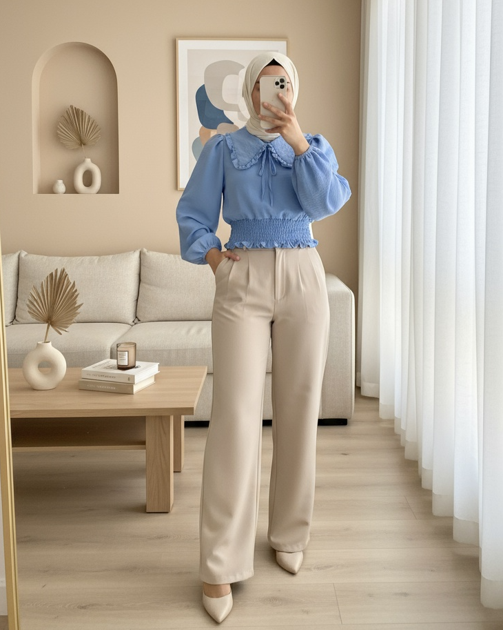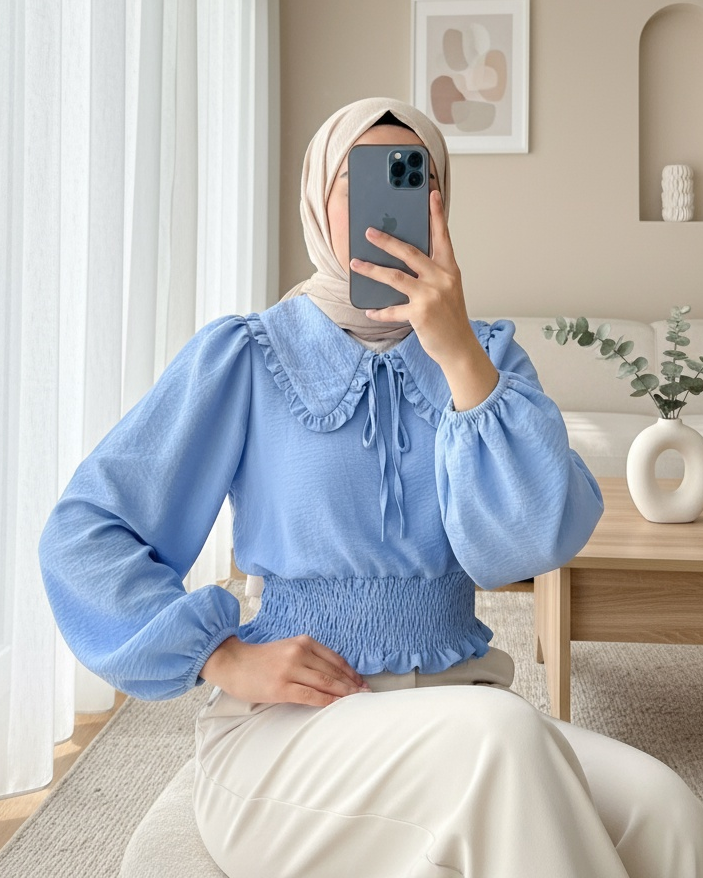 Beli Lastikli Bebe Yaka Uzun Kol Bluz -Mavi-Mavi