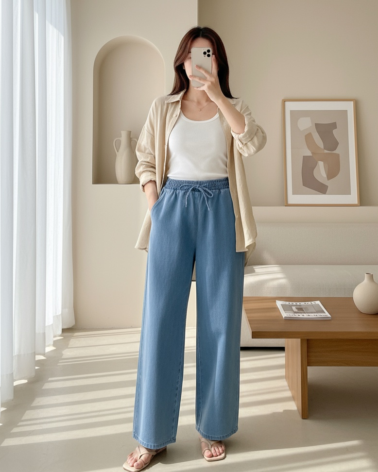 Beli Lastikli Cepli Bol Paça Kot Pantolon -Koyu Mavi-Koyu Mavi