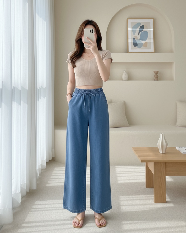 Beli Lastikli Cepli Bol Paça Kot Pantolon -Mavi-Mavi