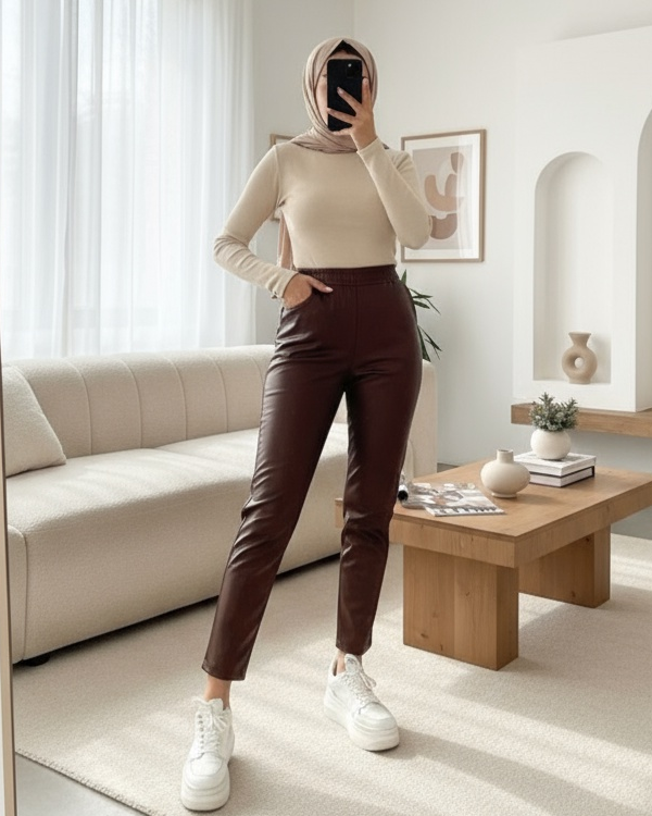 Beli Lastikli Deri Pantolon -Kahve-Kahve