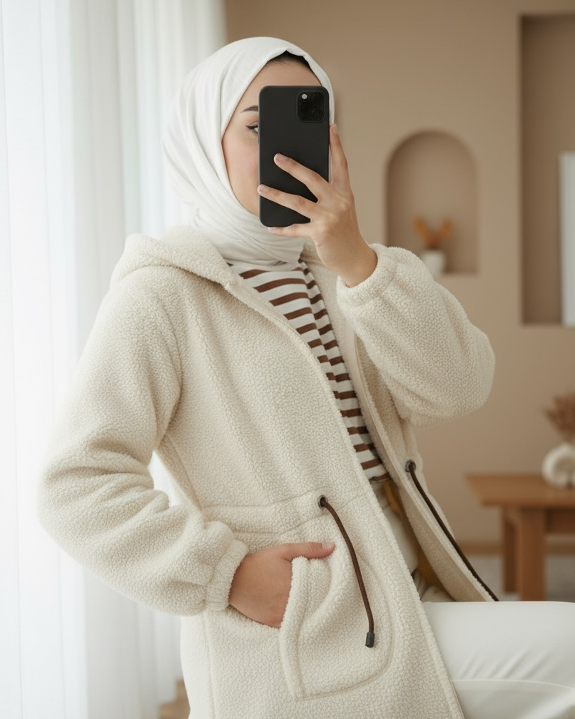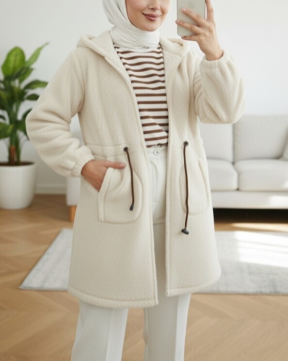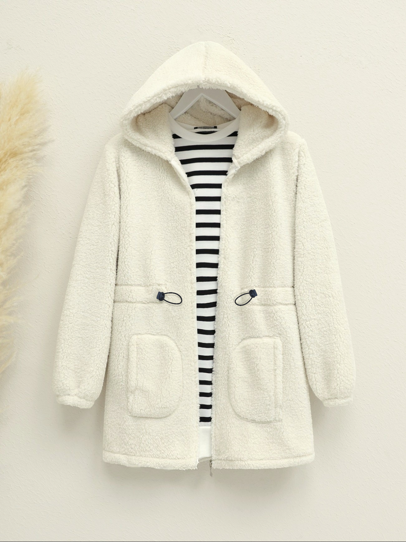Beli Lastikli Kapşonlu Fermuarlı Peluş Mont -Ekru-Ekru
