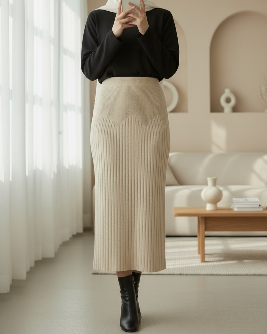 Beli Lastikli Pliseli Triko Etek -Krem-Krem