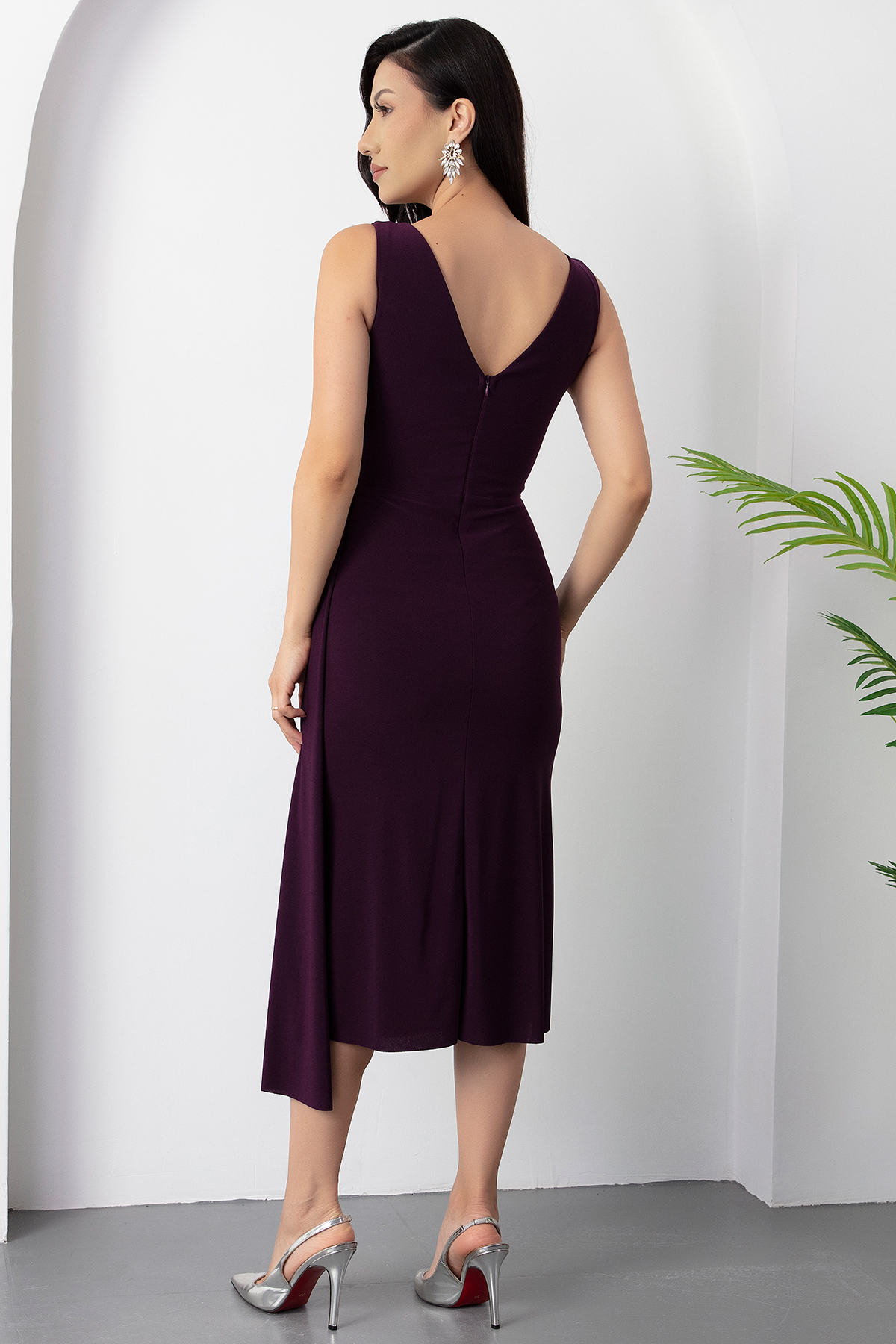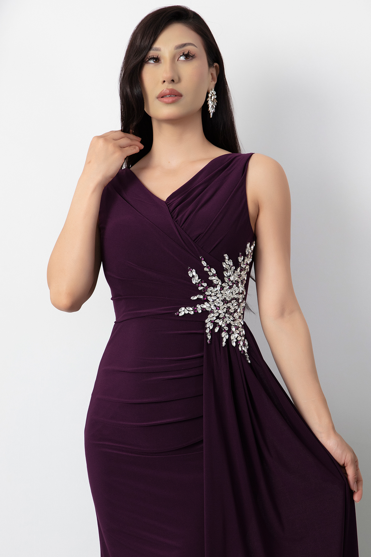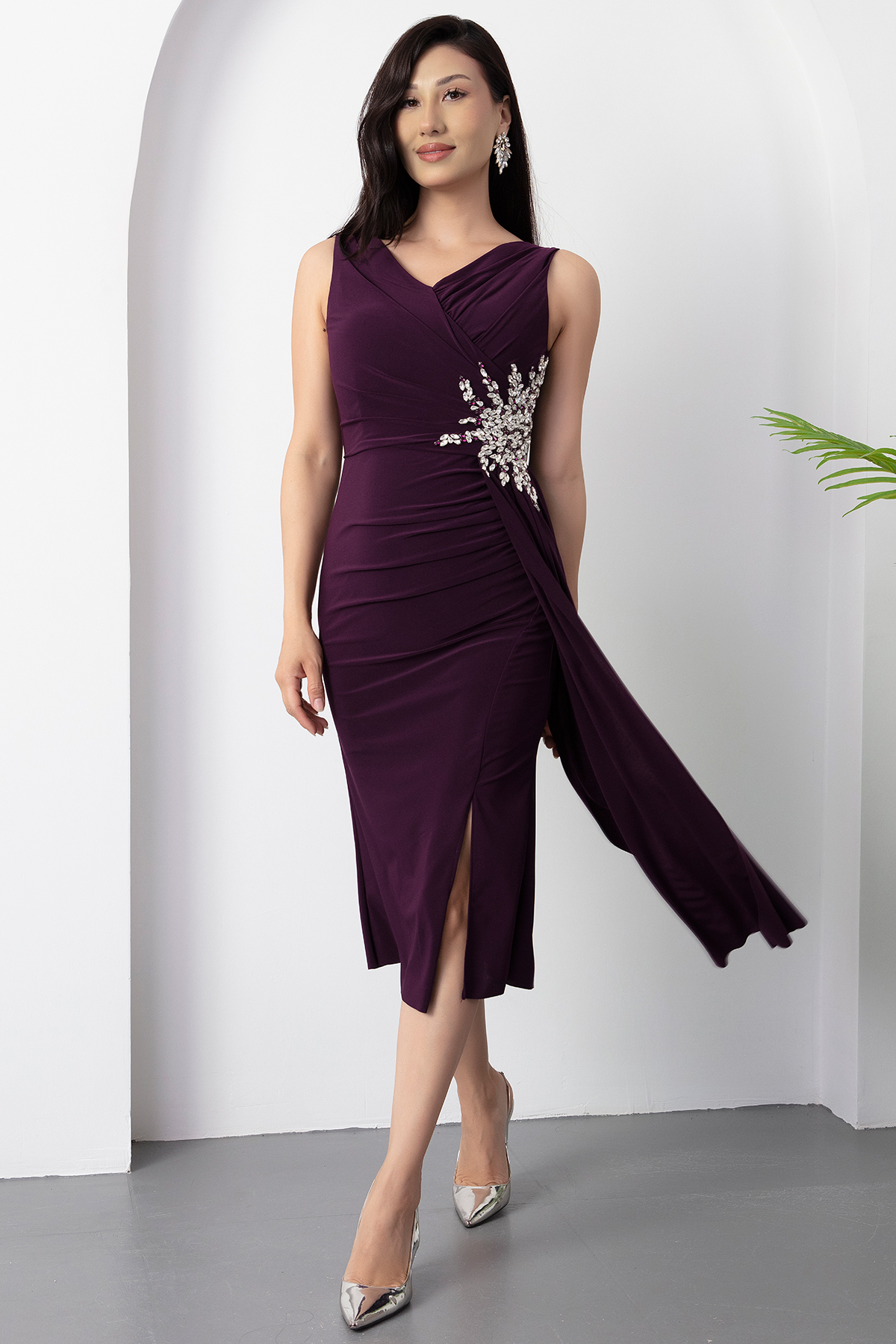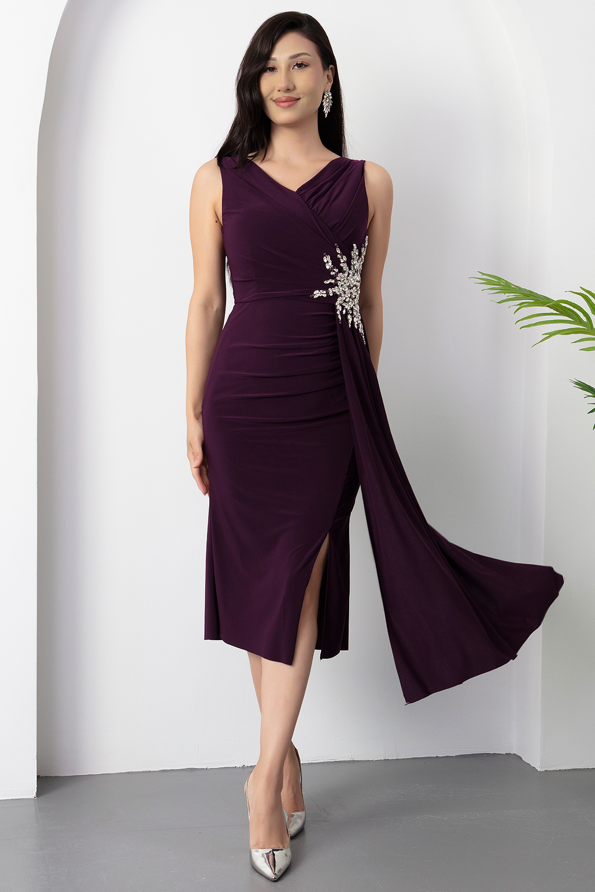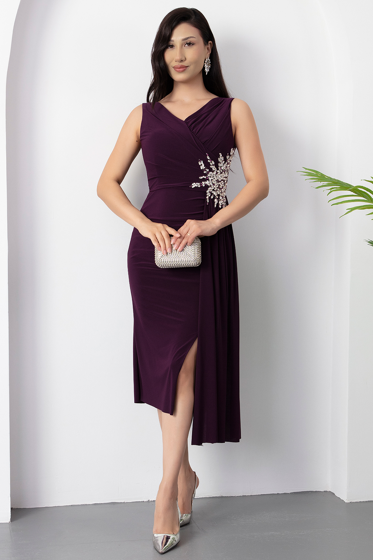 Beli Taşlı Yırtmaçlı Kısa Abiye Elbise 13464-MURDUM