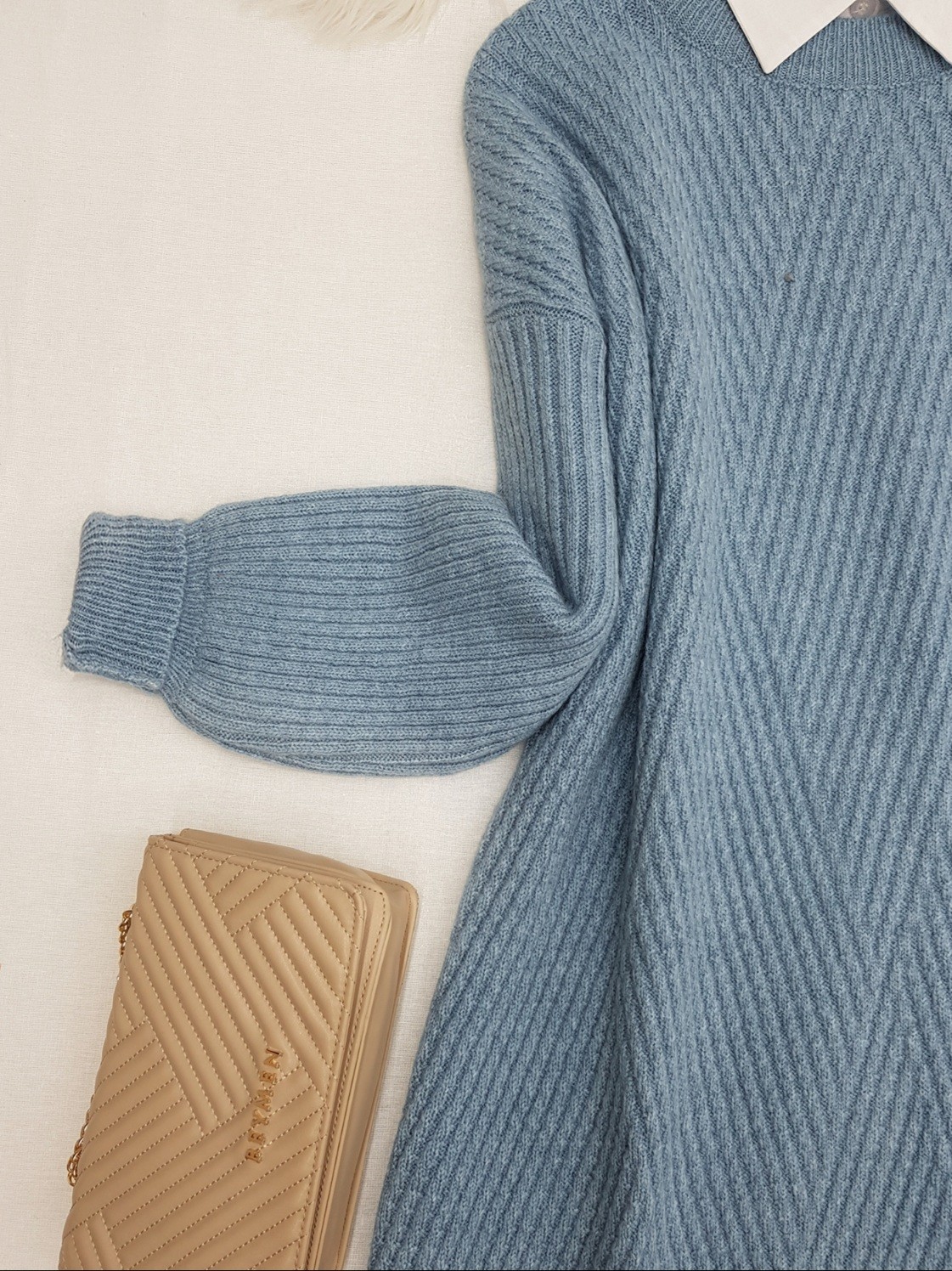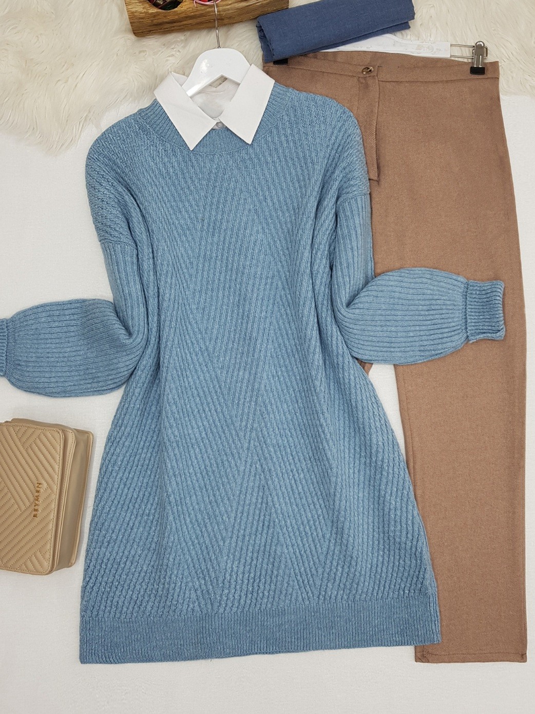Bisiklet Yaka Baklava Desen Triko Kazak -Mavi-Mavi