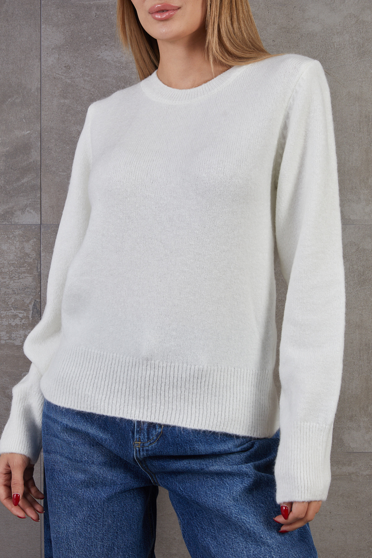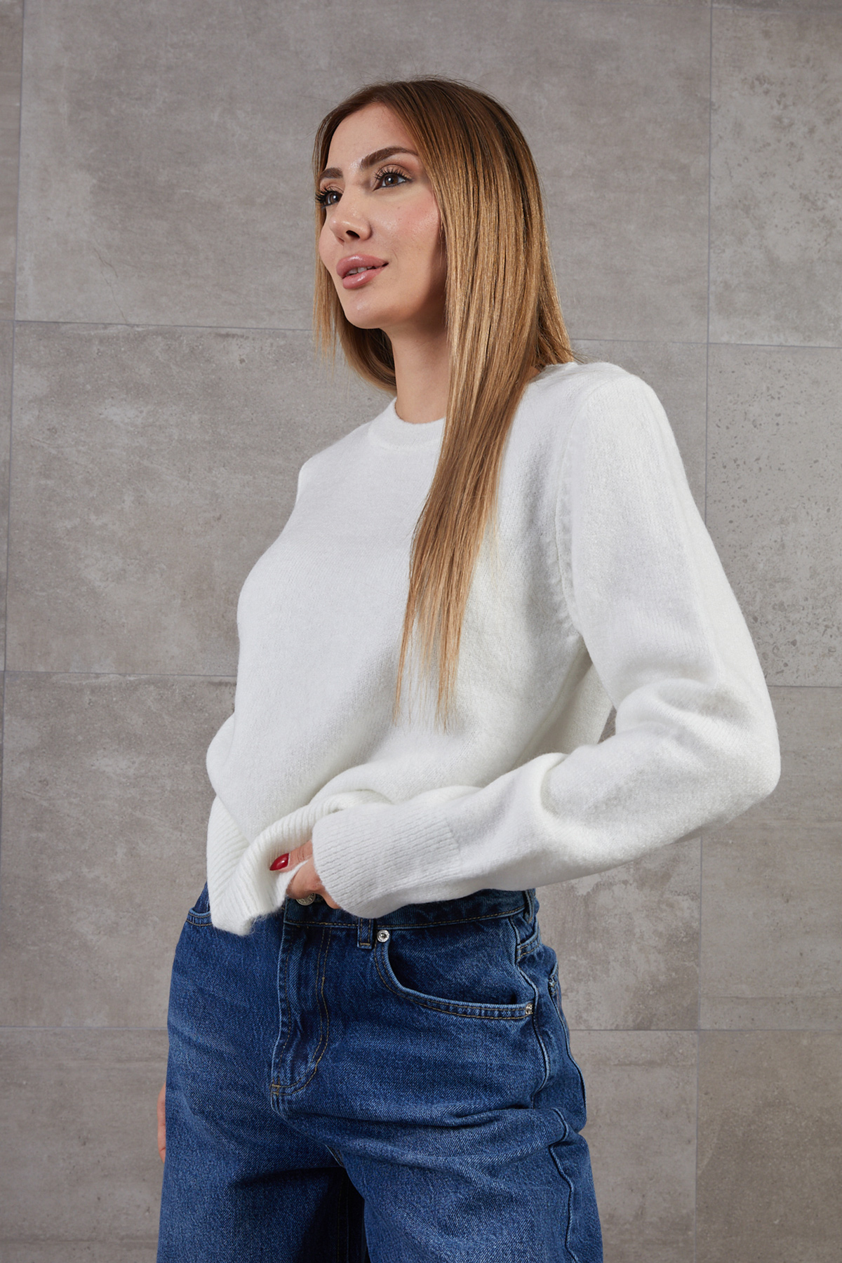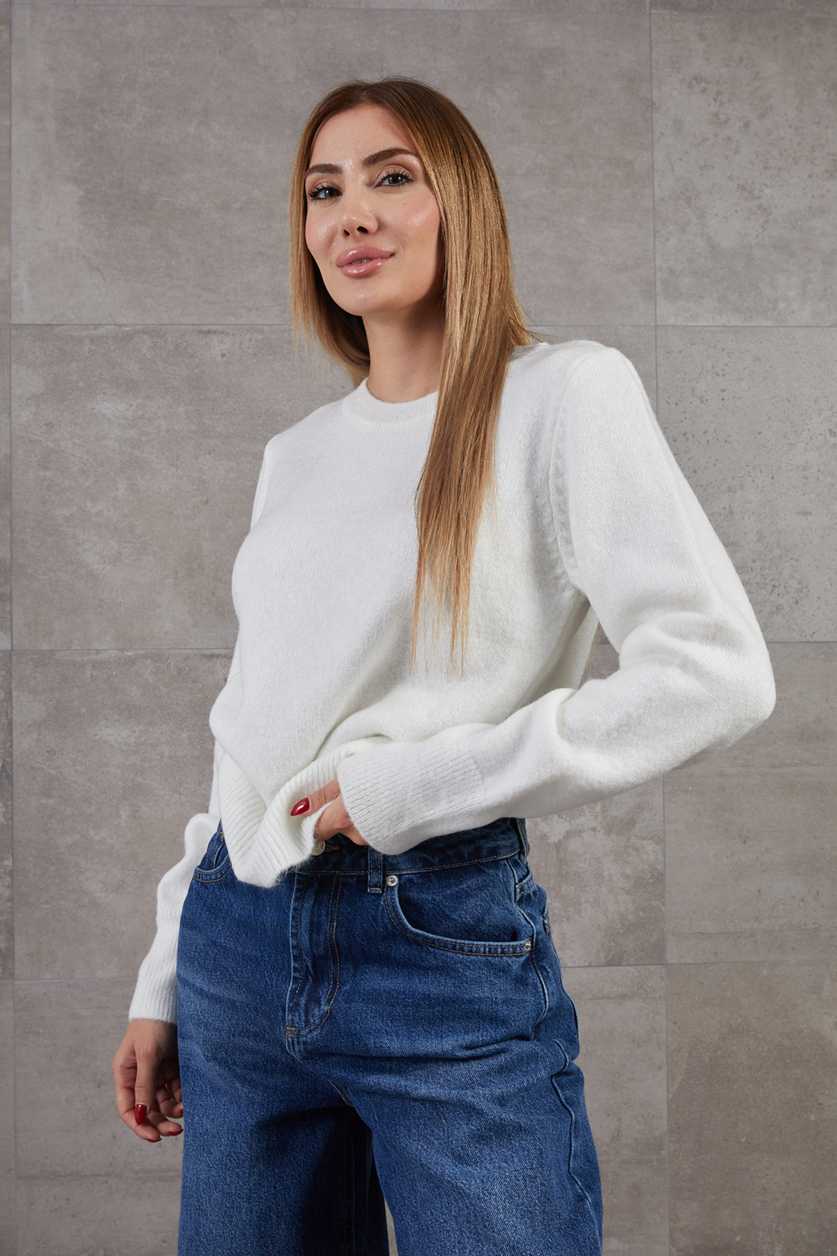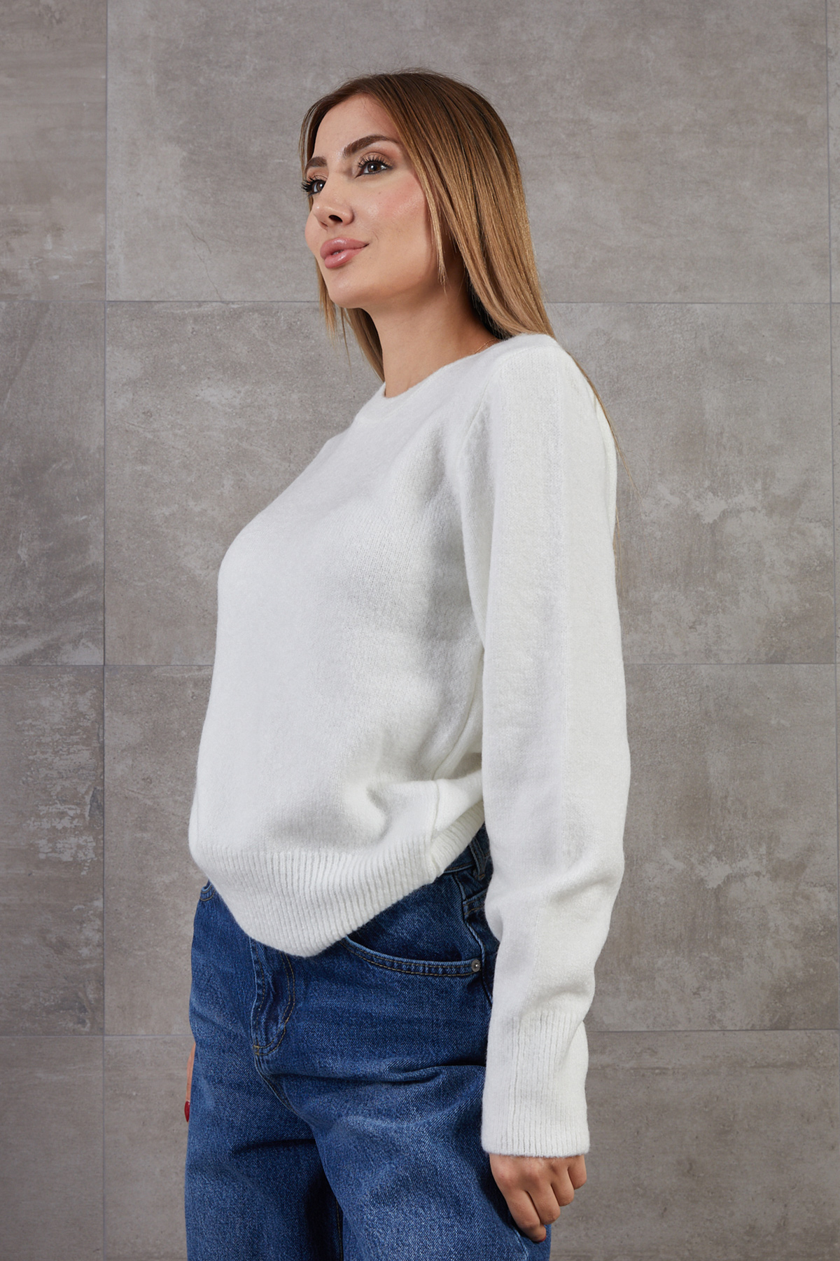 Bisiklet Yaka Basic Triko Kazak-Ekru
