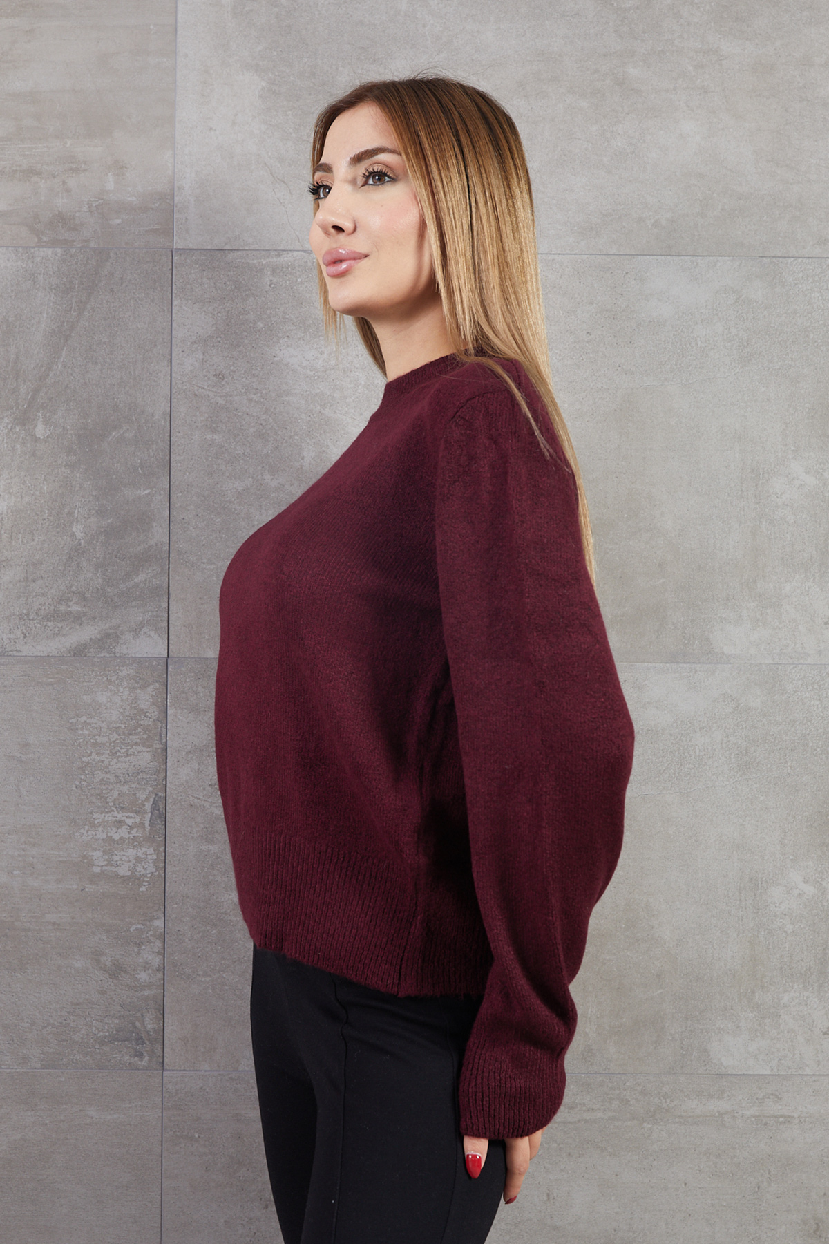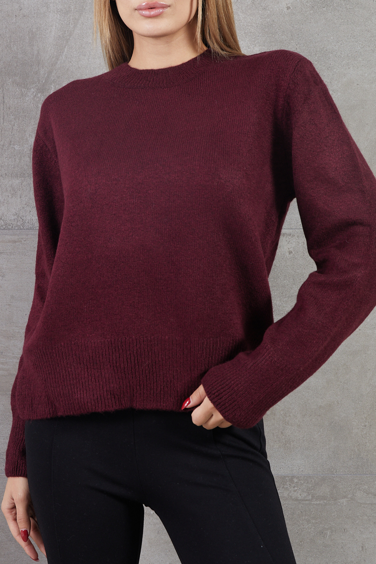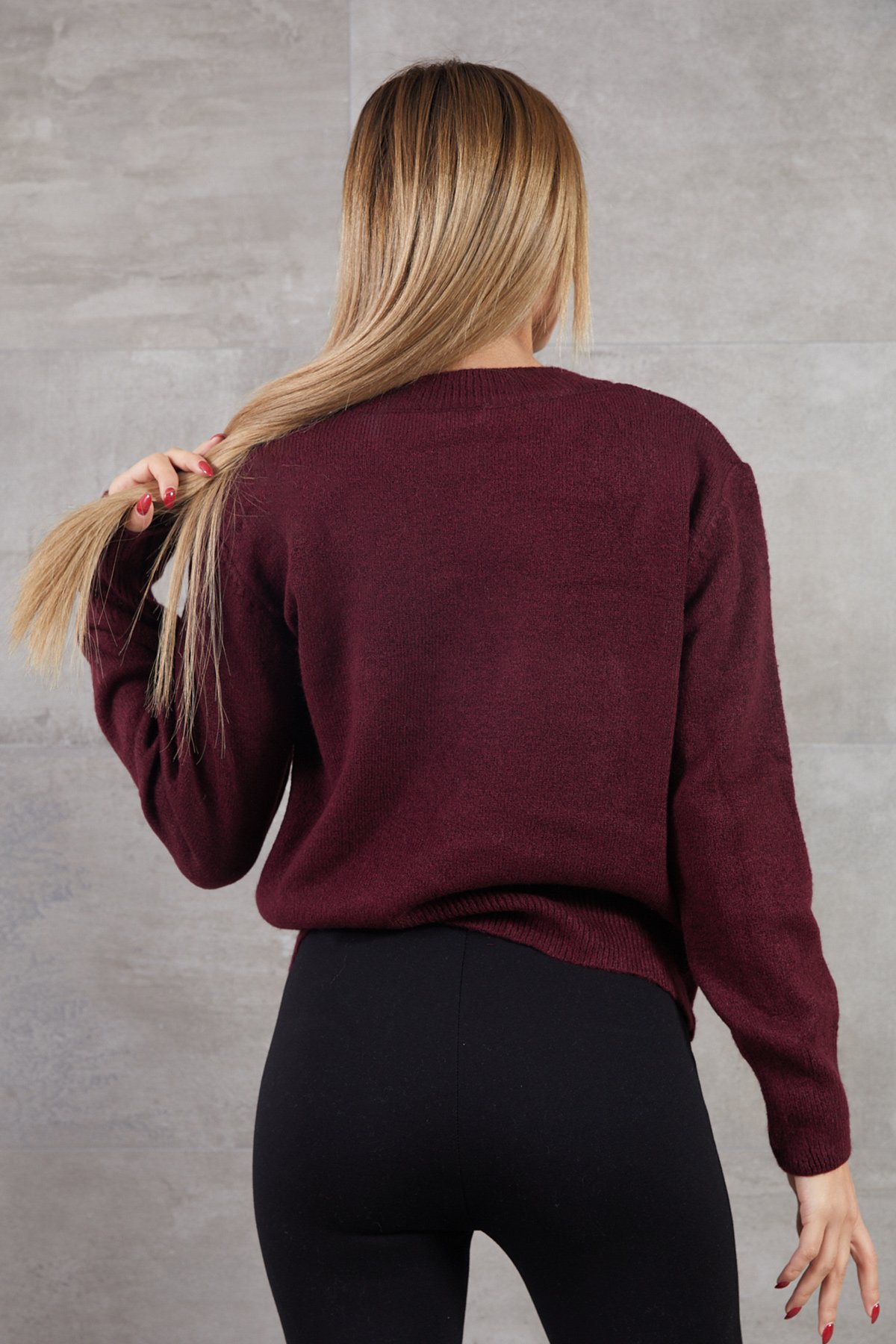Bisiklet Yaka Basic Triko Kazak-Bordo