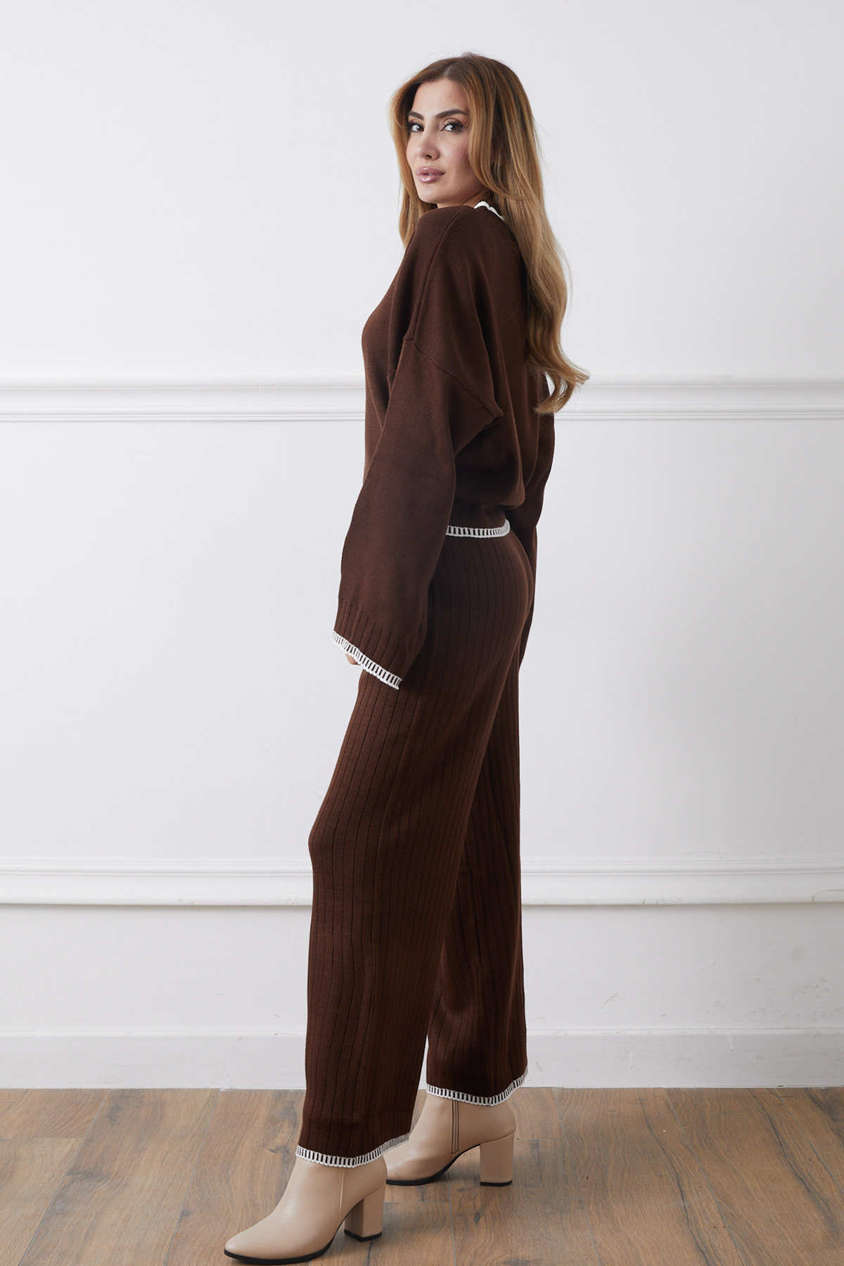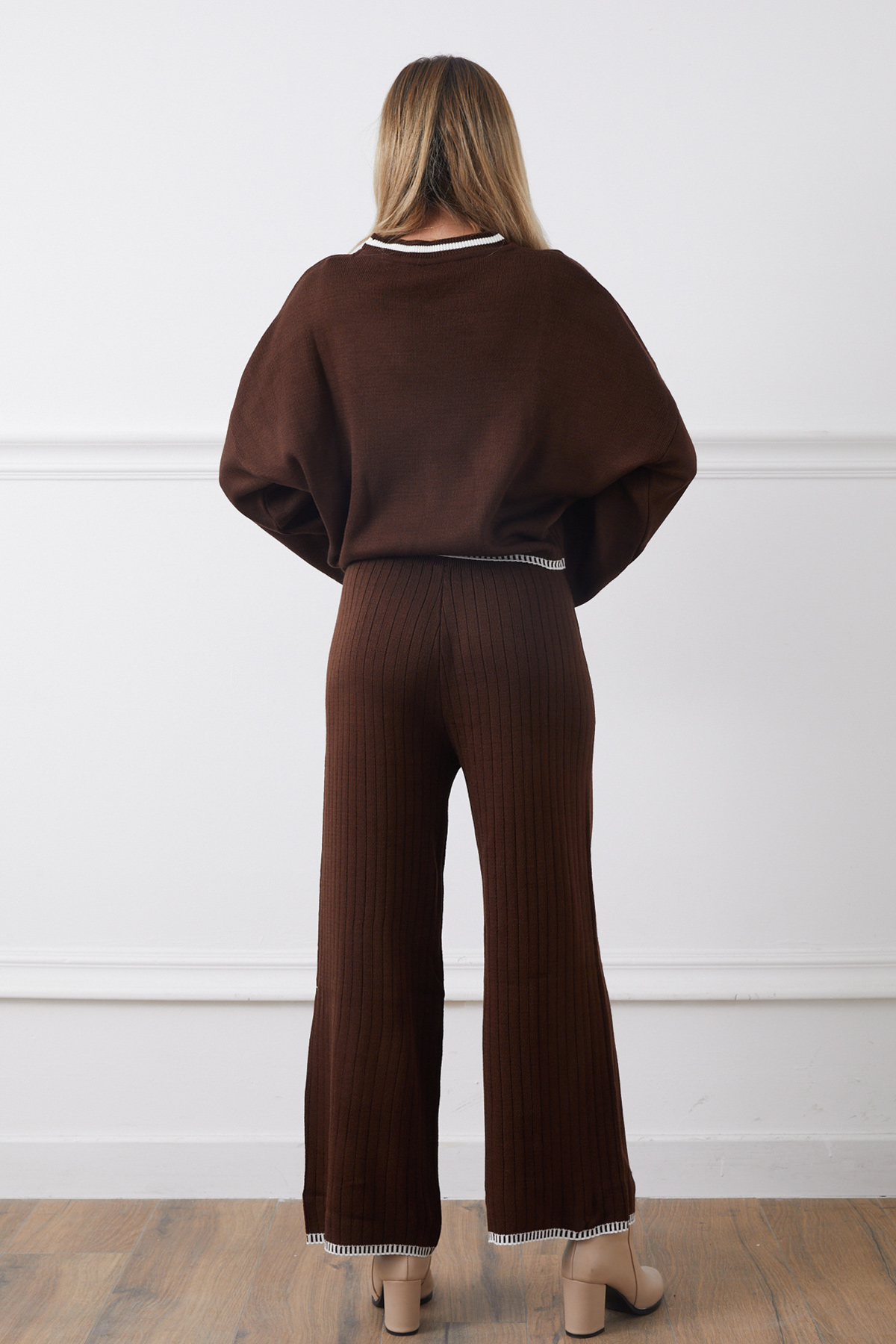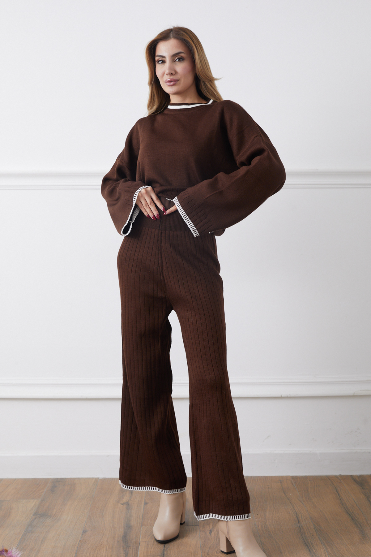 Bisiklet Yaka Çoban Dikişli Kazak Pantolon Triko İkili Takım-Kahve