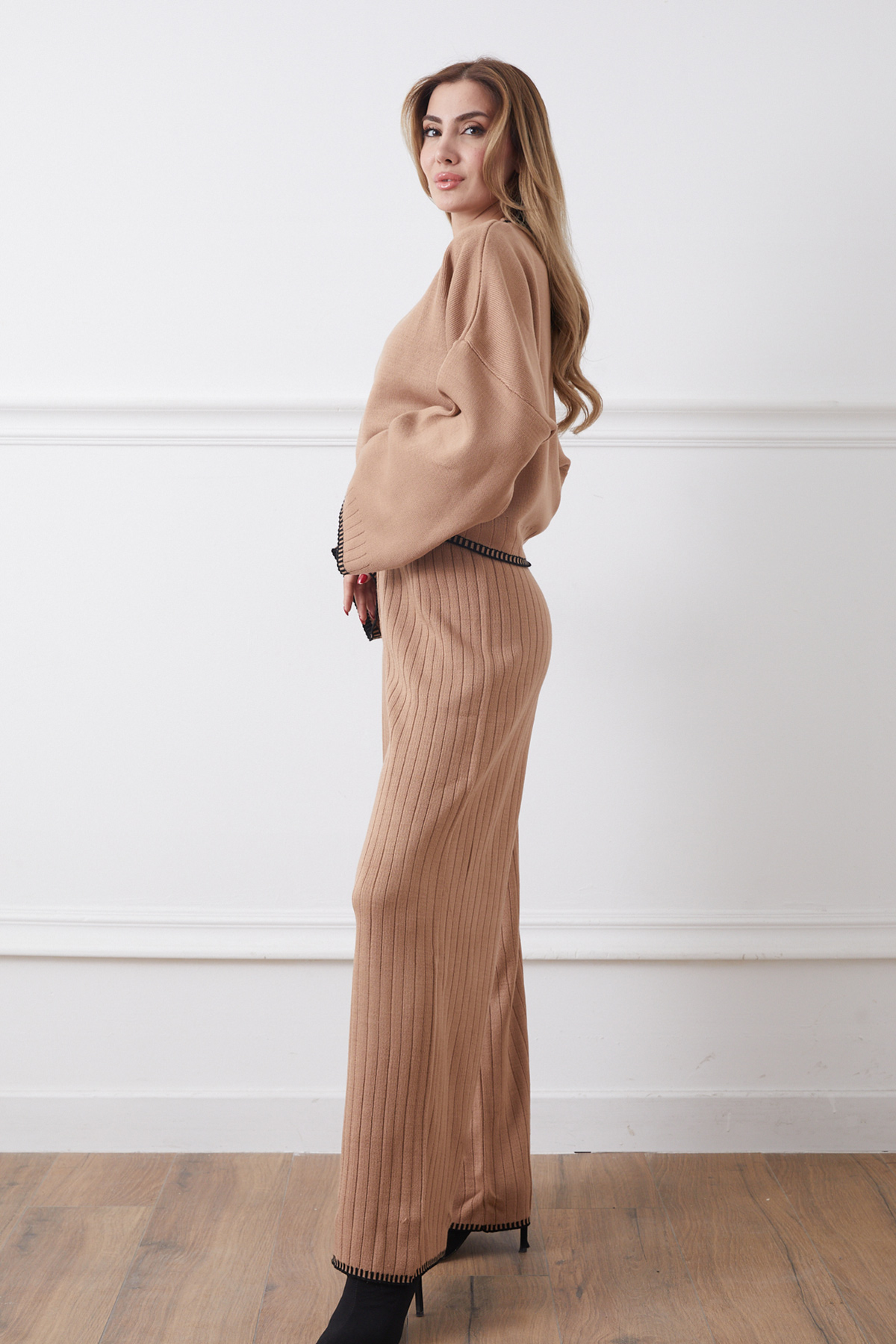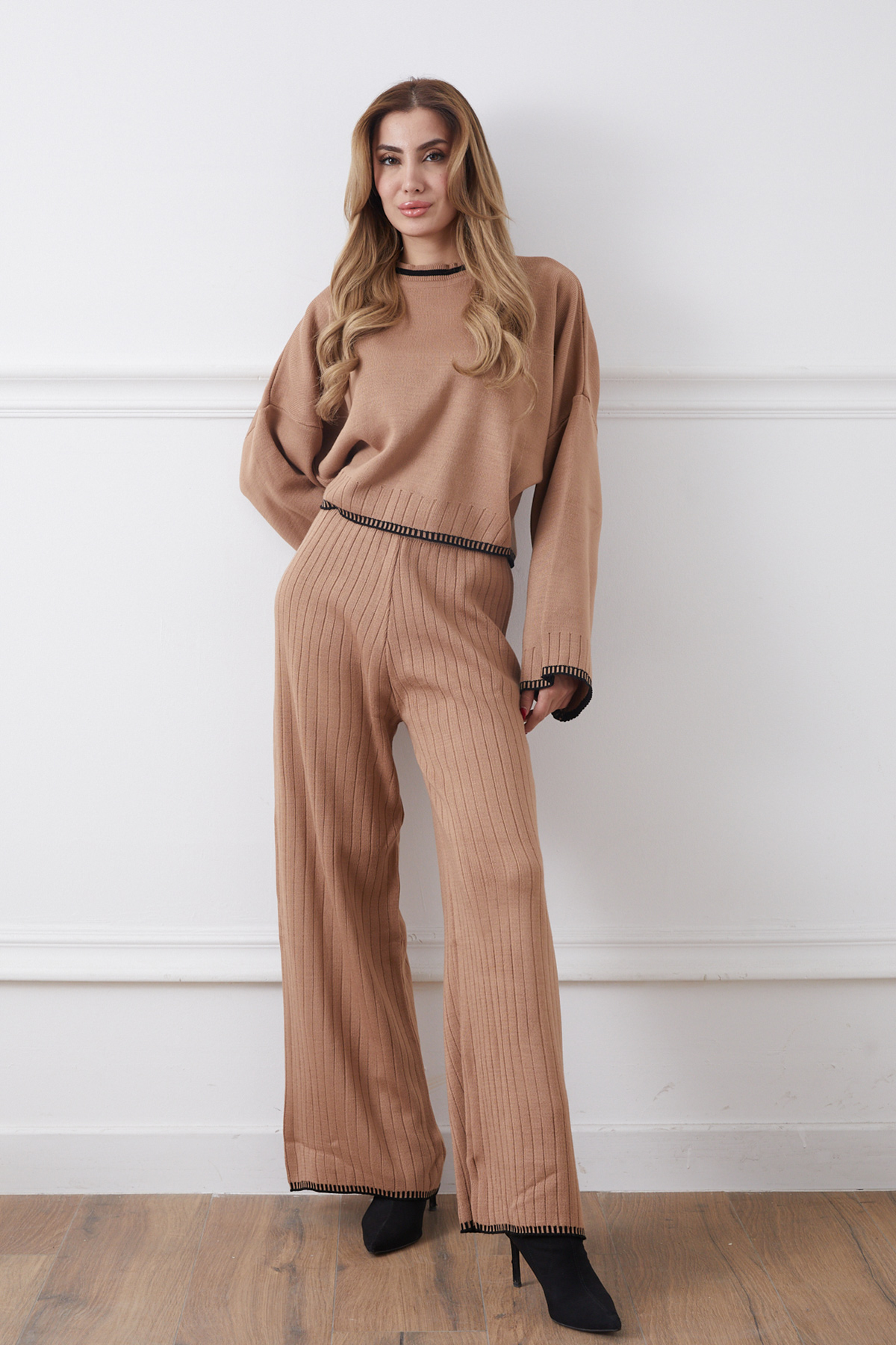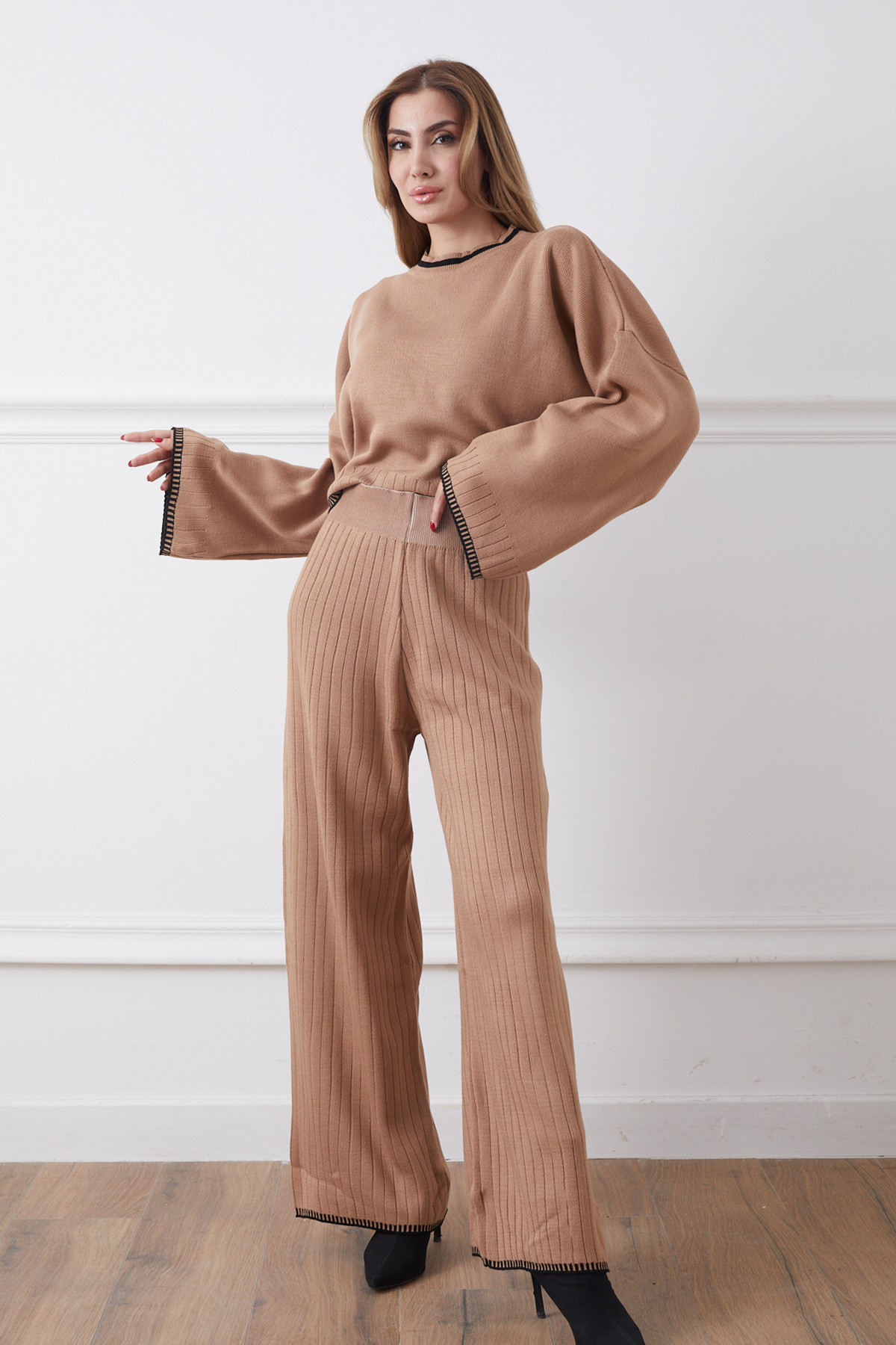 Bisiklet Yaka Çoban Dikişli Kazak Pantolon Triko İkili Takım-Açık Kahve
