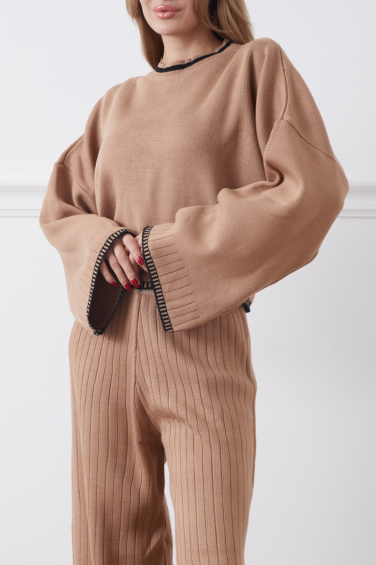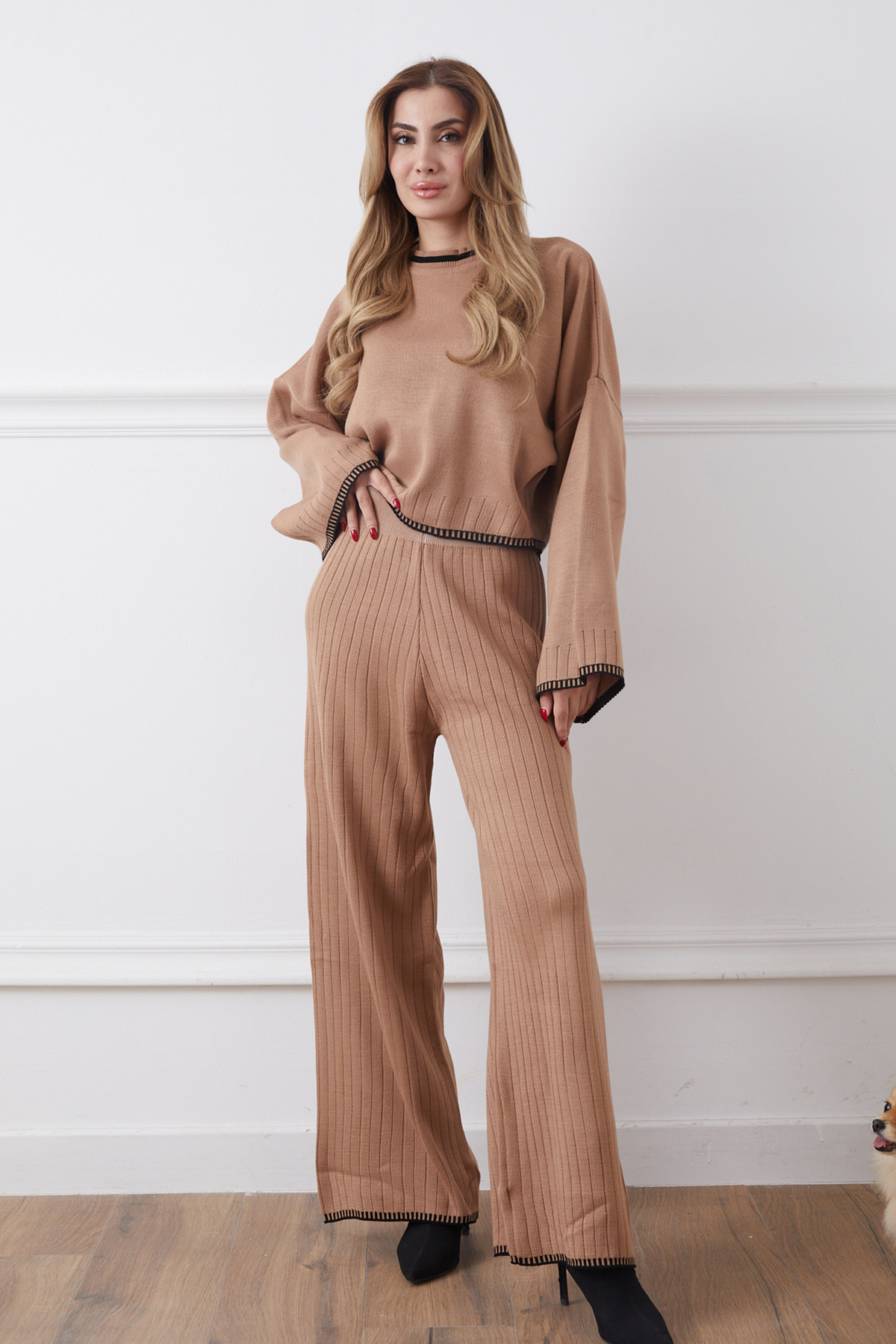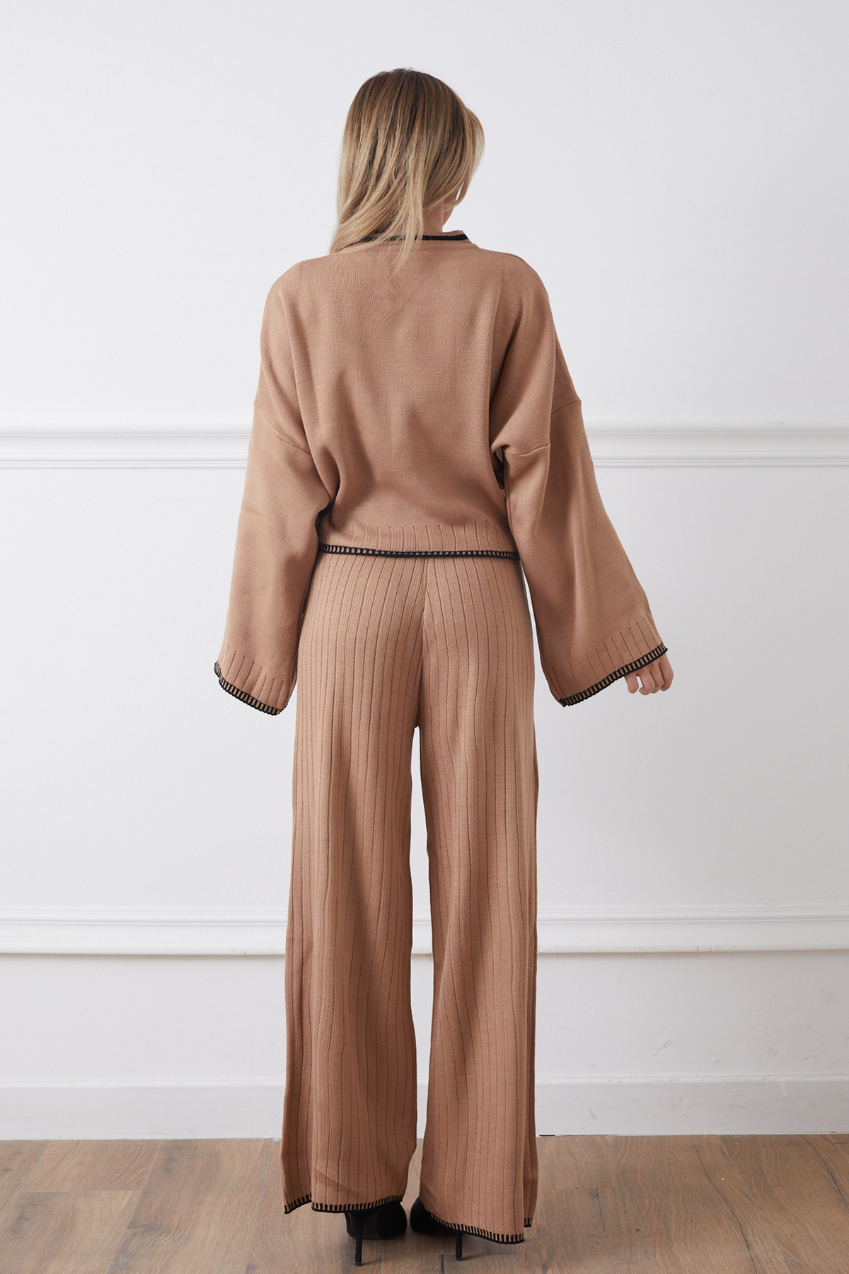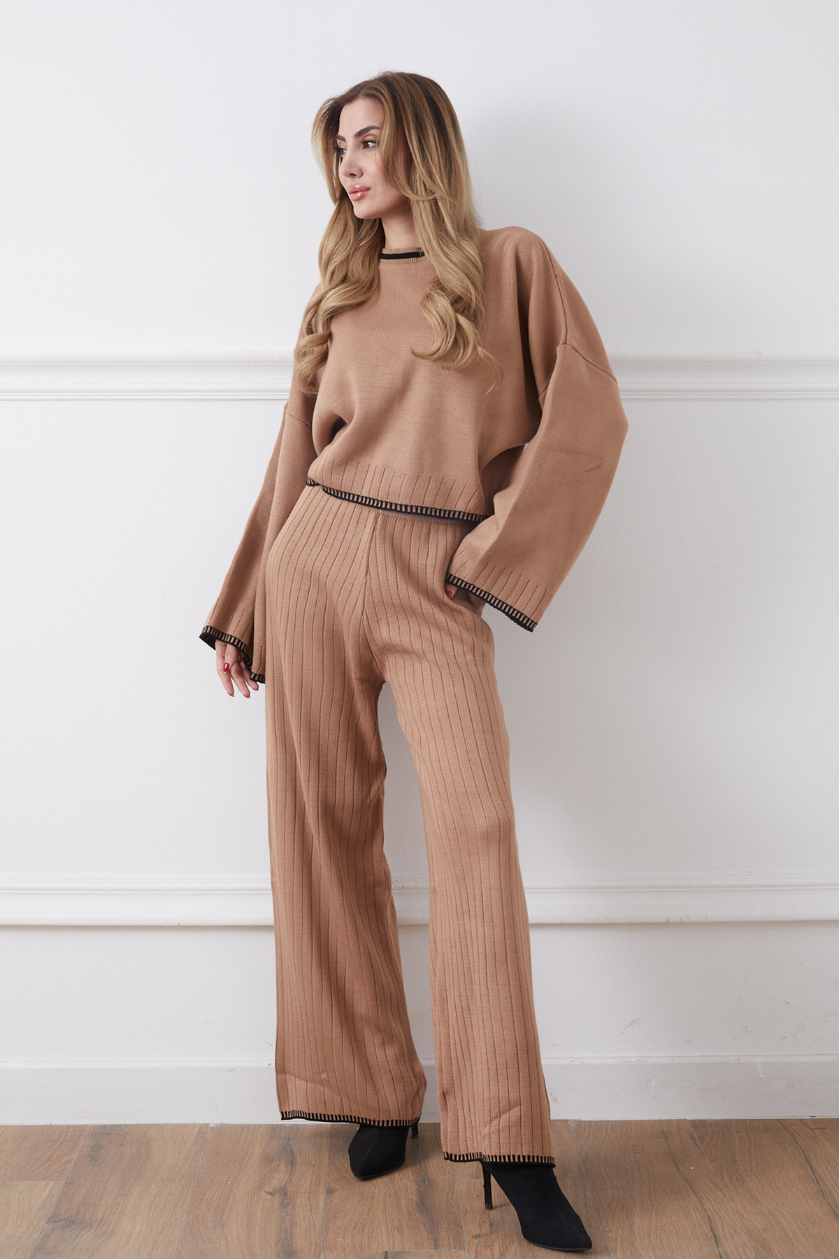 Bisiklet Yaka Çoban Dikişli Kazak Pantolon Triko İkili Takım-Açık Kahve