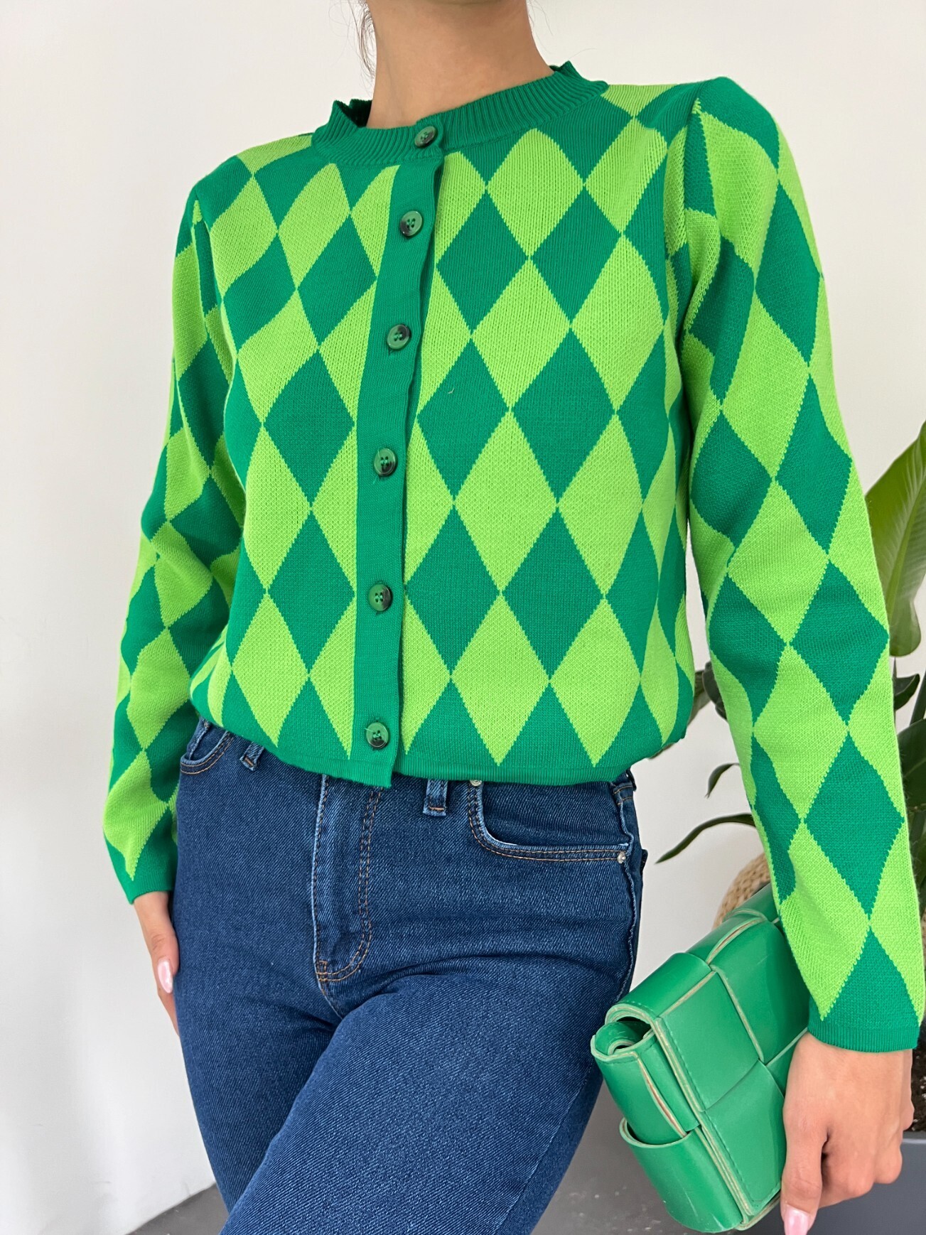 Bisiklet Yaka Düğmeli Baklava Desen Hırka -Yeşil-Yeşil