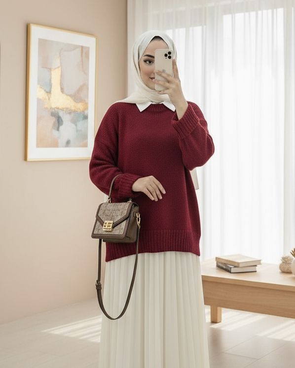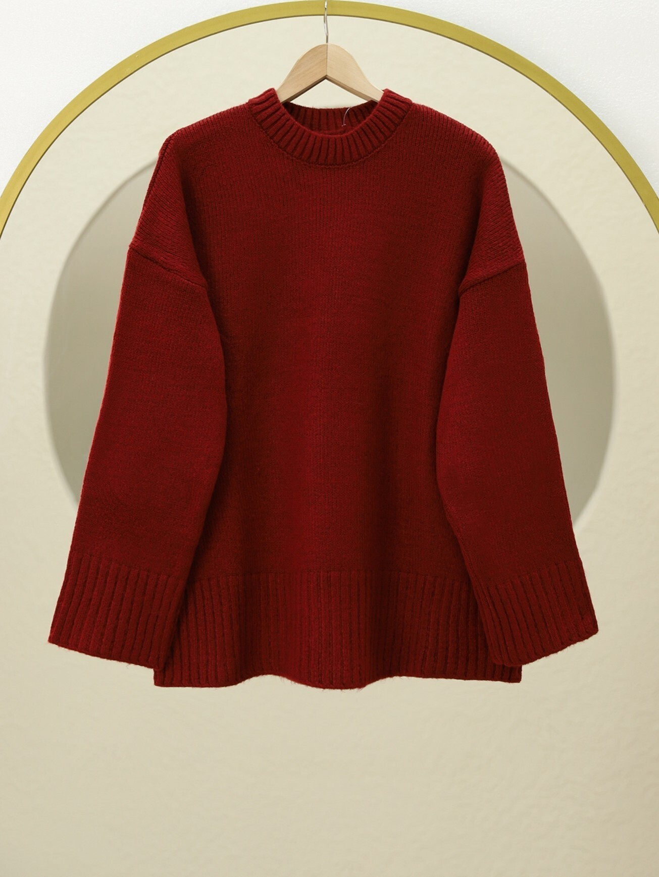 Bisiklet Yaka Eteği Fitilli Salaş Triko Kazak -Bordo-Bordo