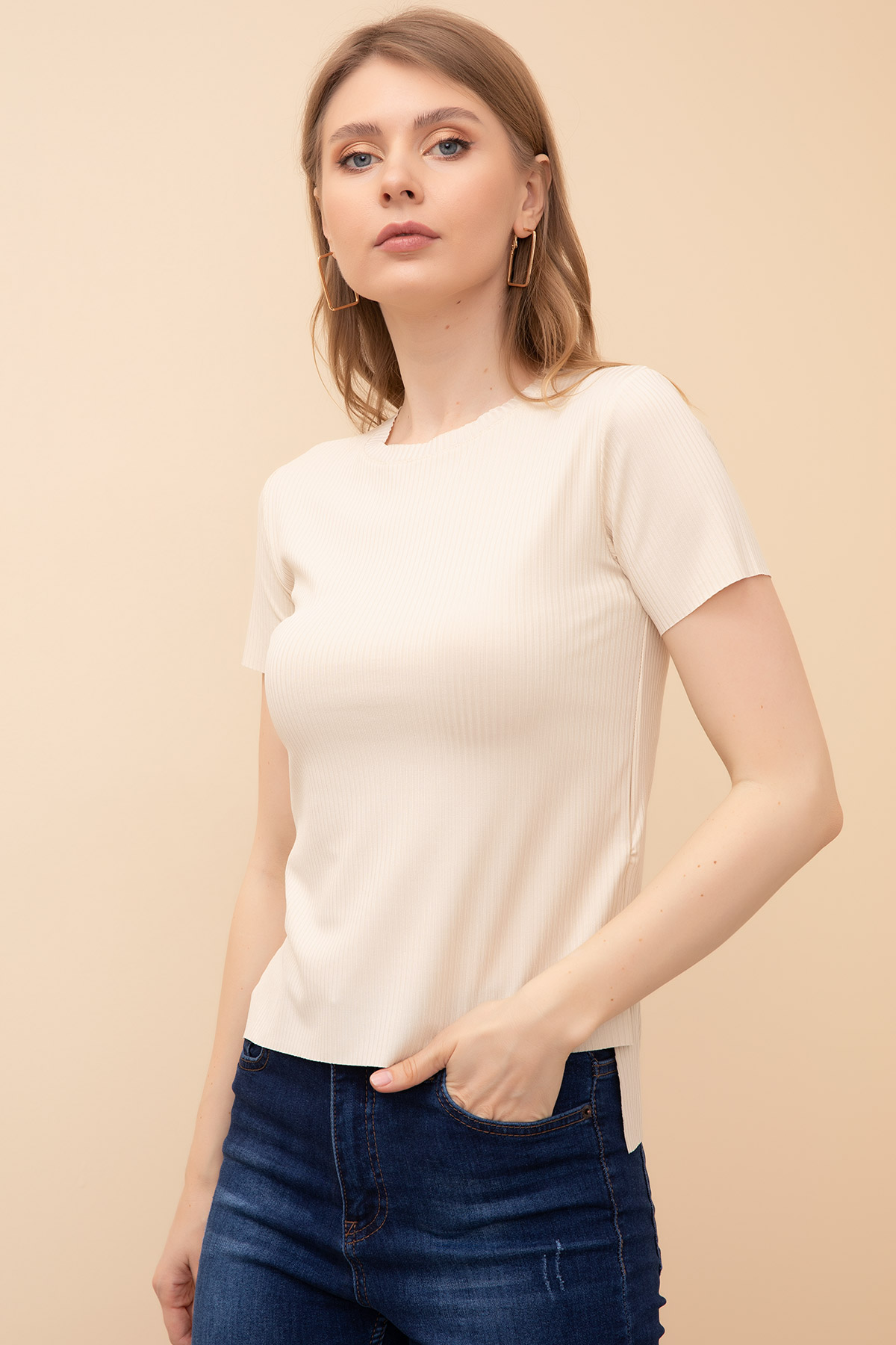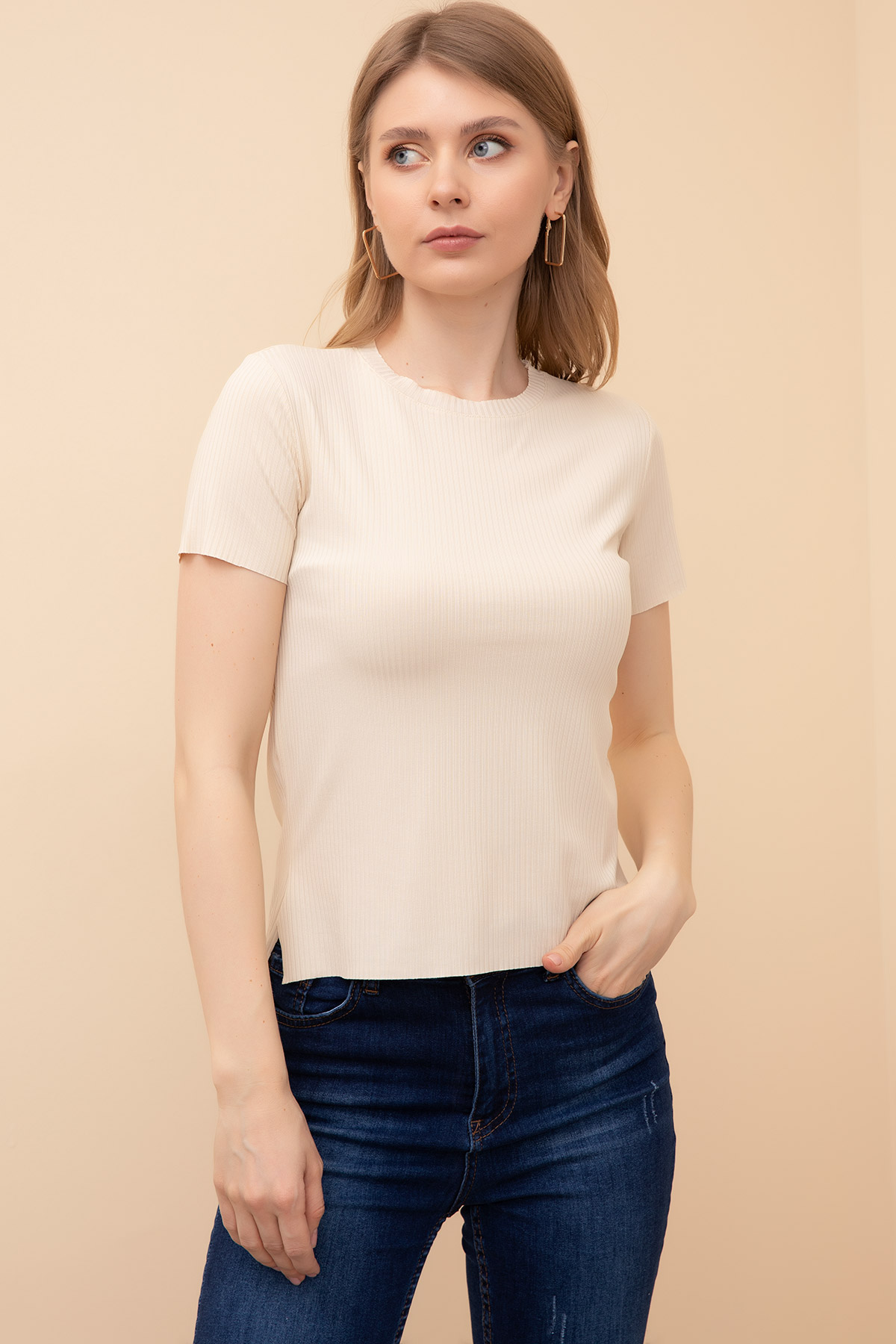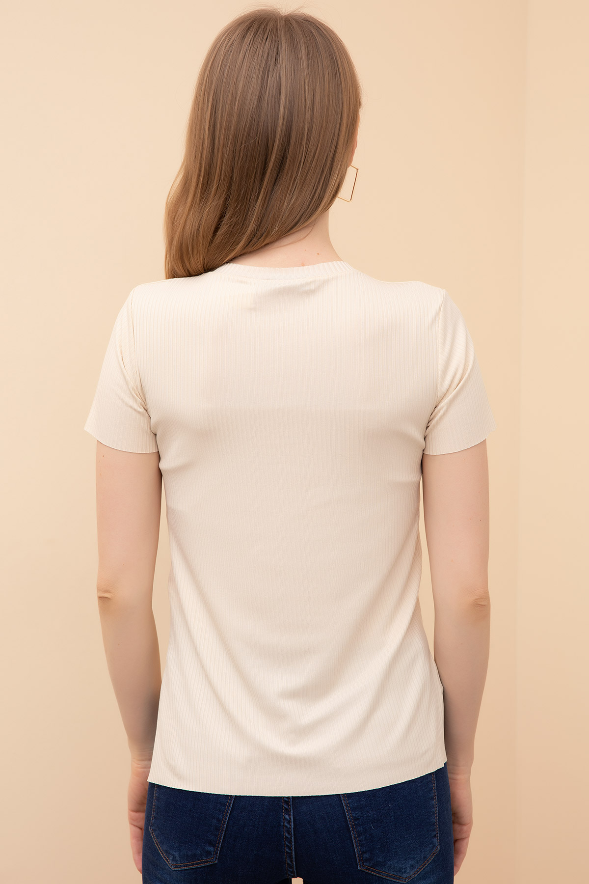 Bisiklet Yaka Fitilli Bluz-Bej