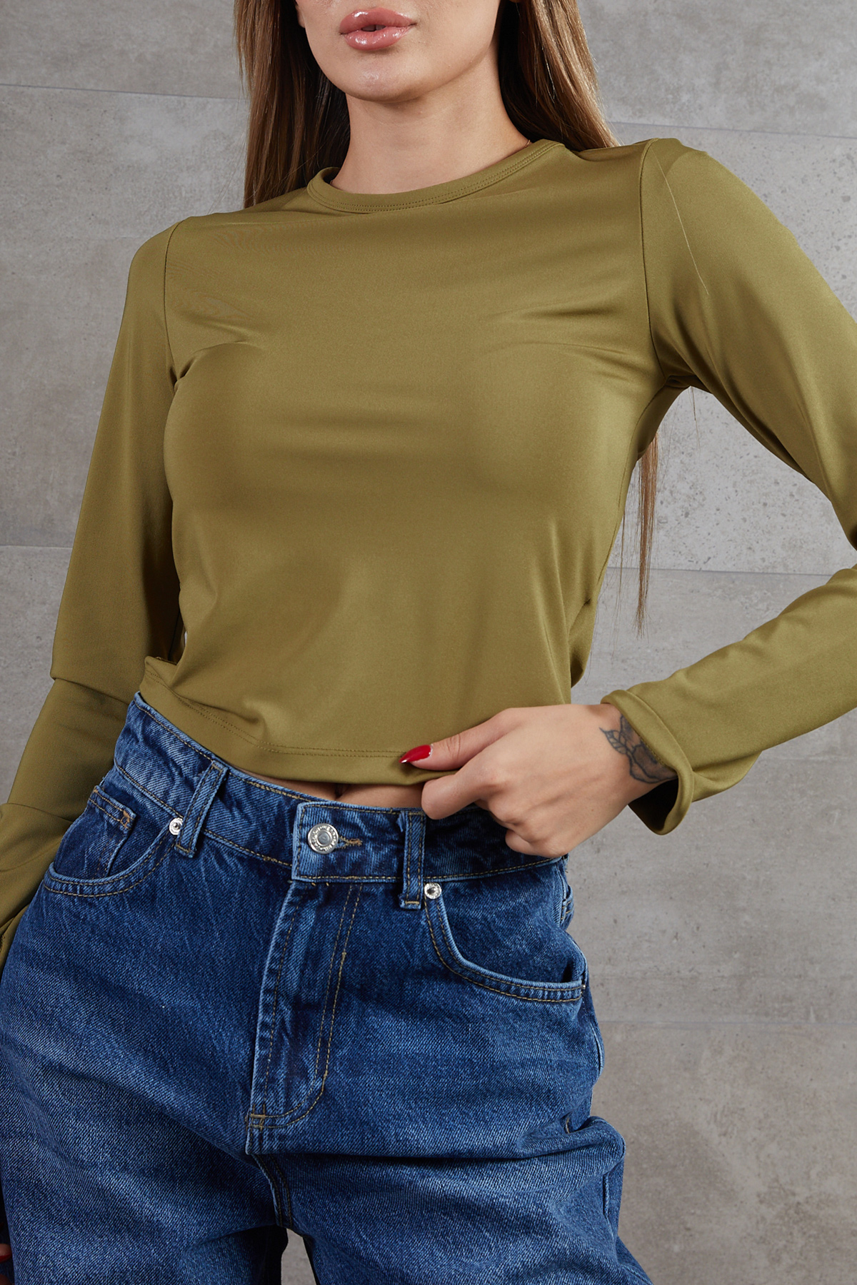 Bisiklet Yaka Uzun Kol Parmak Detaylı Basic Body-Yağ Yeşili
