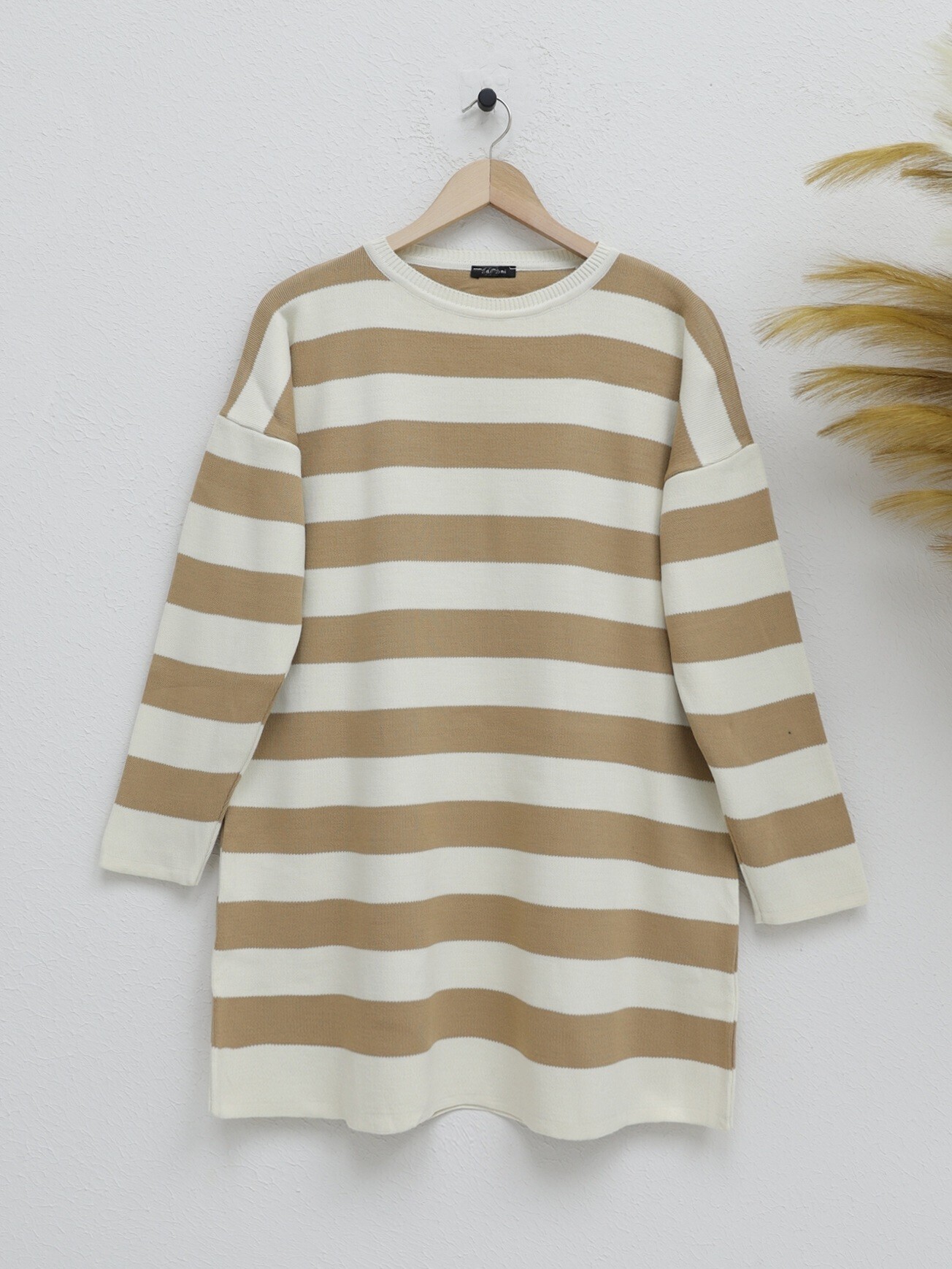 Bisiklet Yaka Yan Çizgili Triko Tunik -Vizon-Vizon