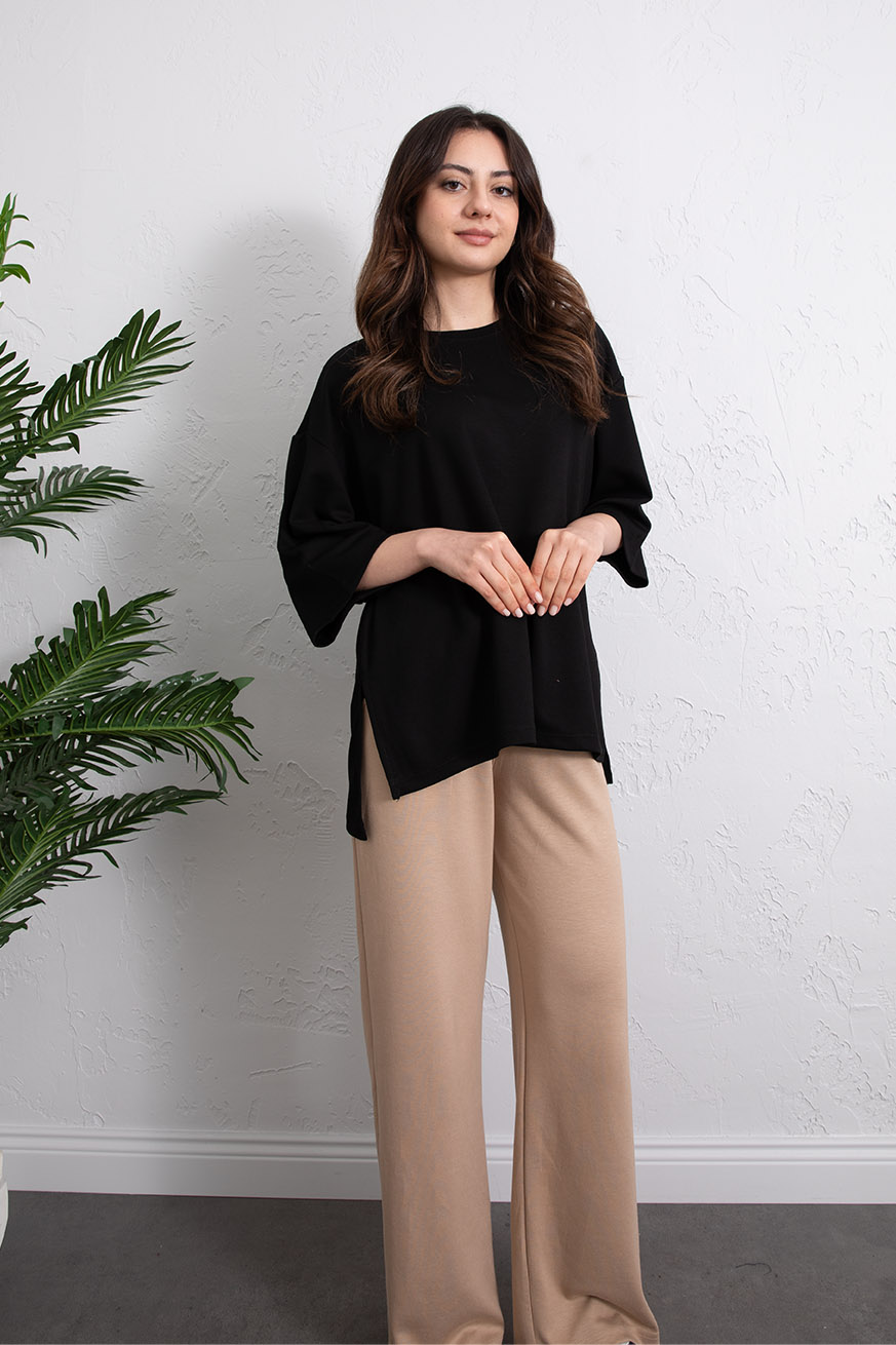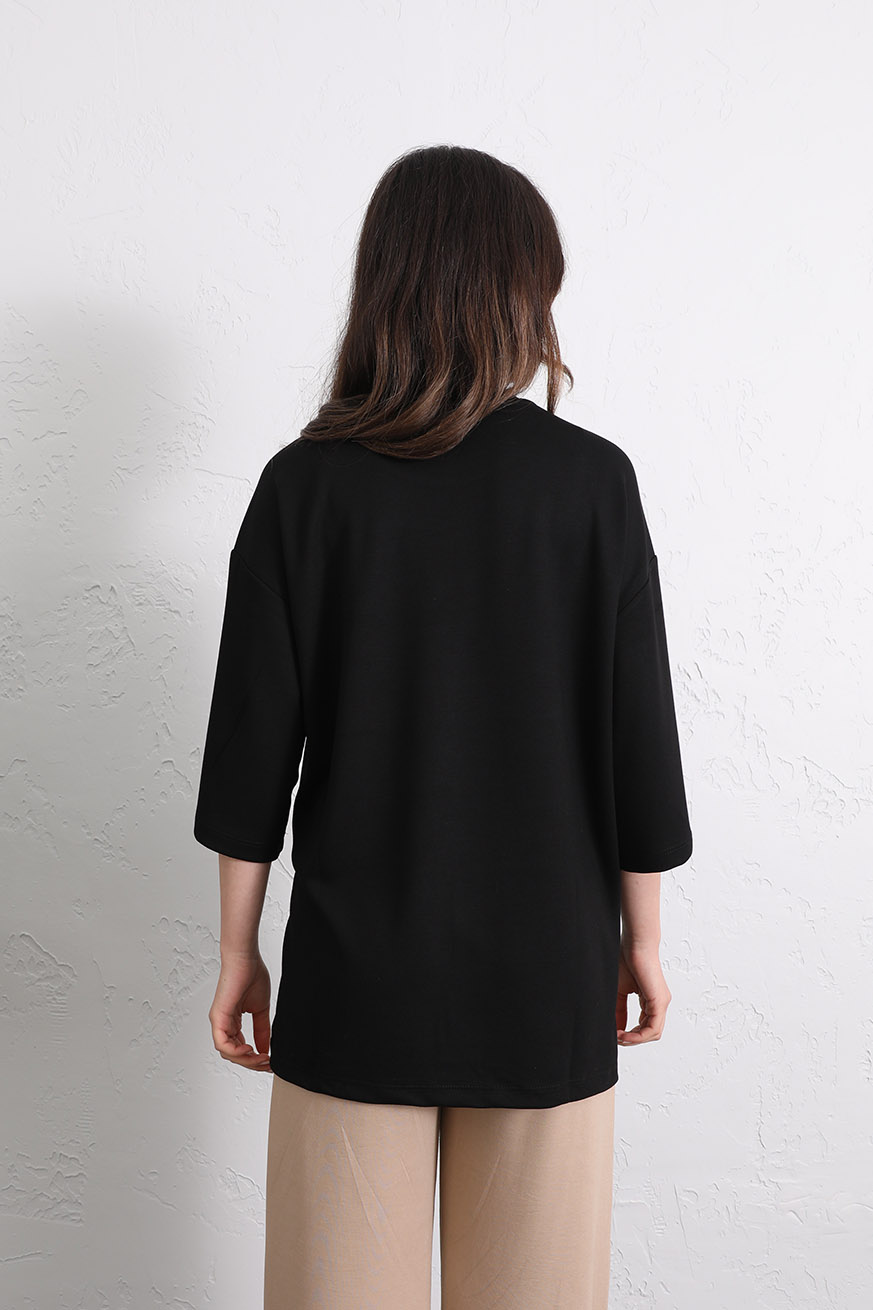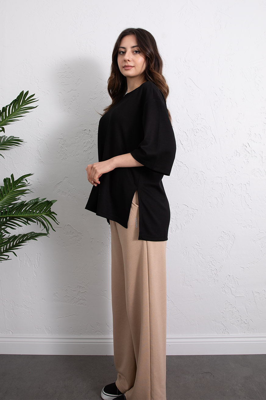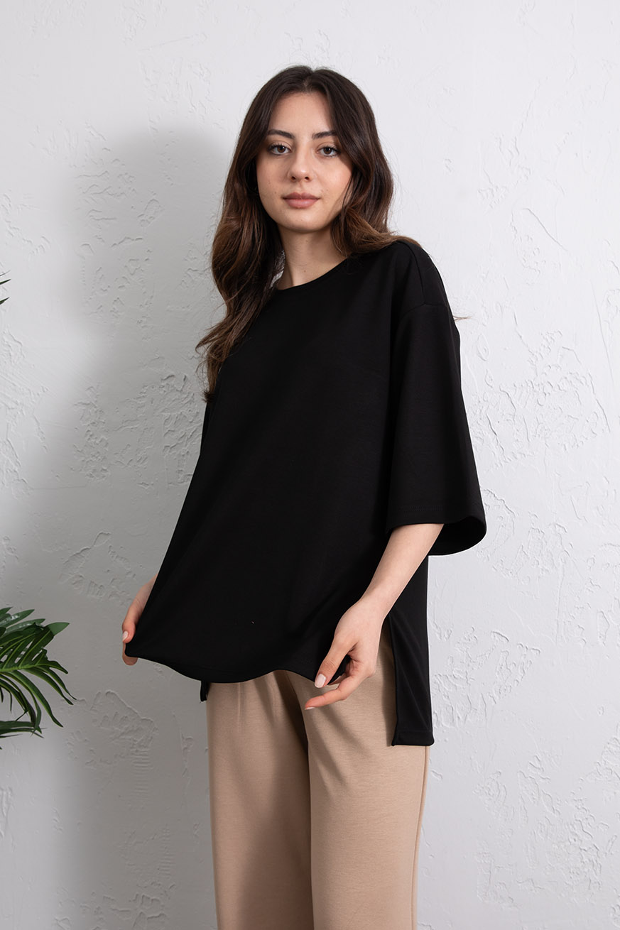 Bisiklet Yaka Yan Yırtmaçlı Tişört Siyah - 11066-Siyah