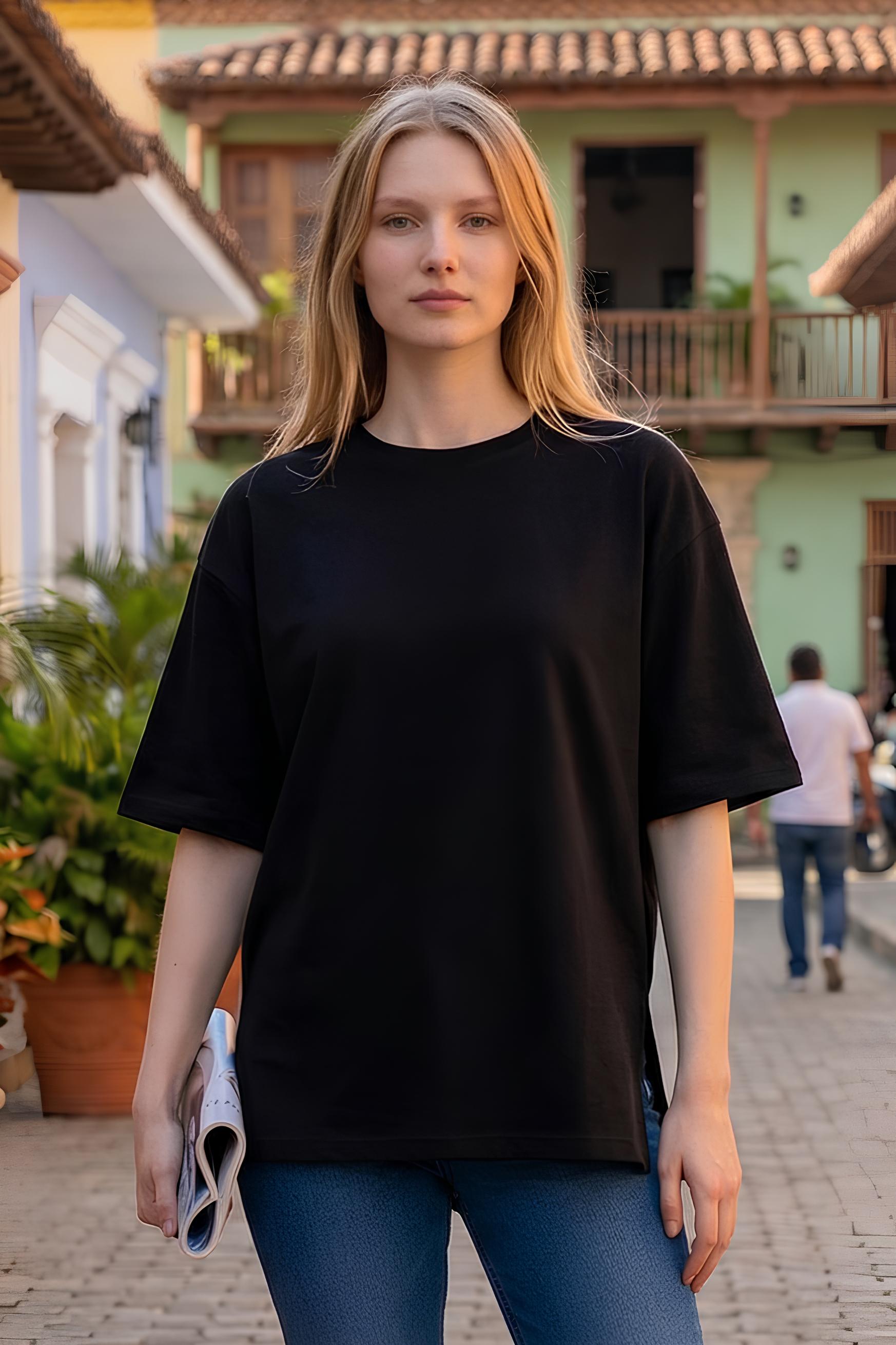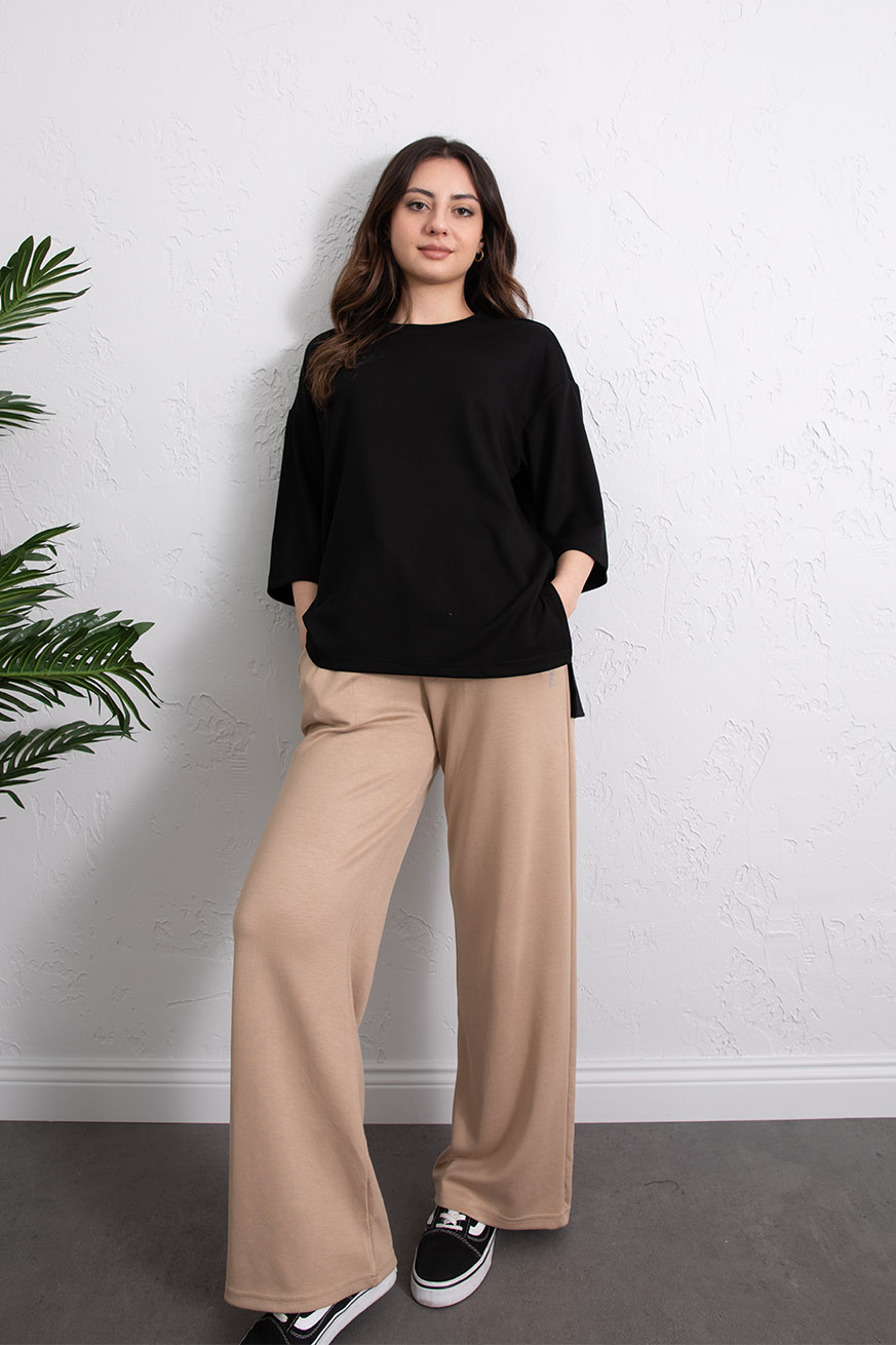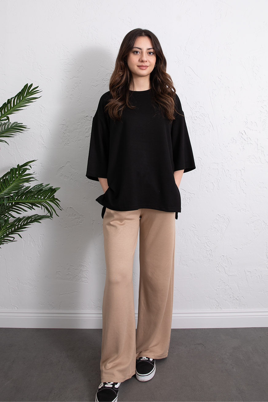 Bisiklet Yaka Yan Yırtmaçlı Tişört Siyah - 11066-Siyah