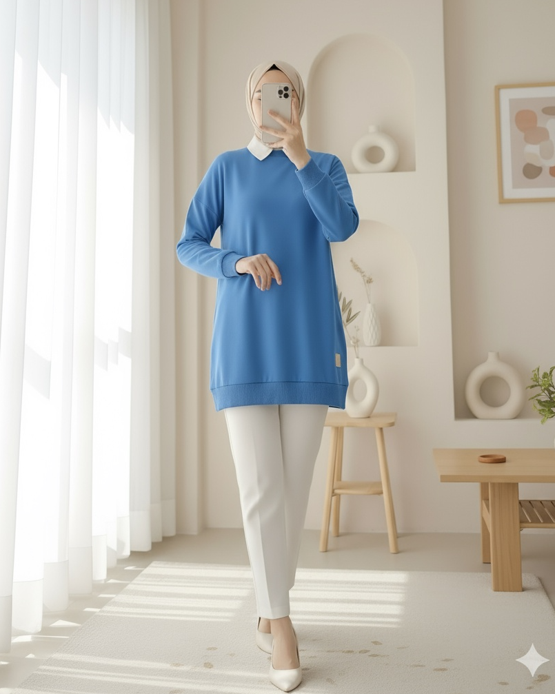 Bisiklet Yaka Yırtmaçlı Armalı Sweat -Mavi-Mavi