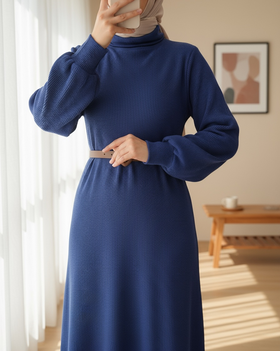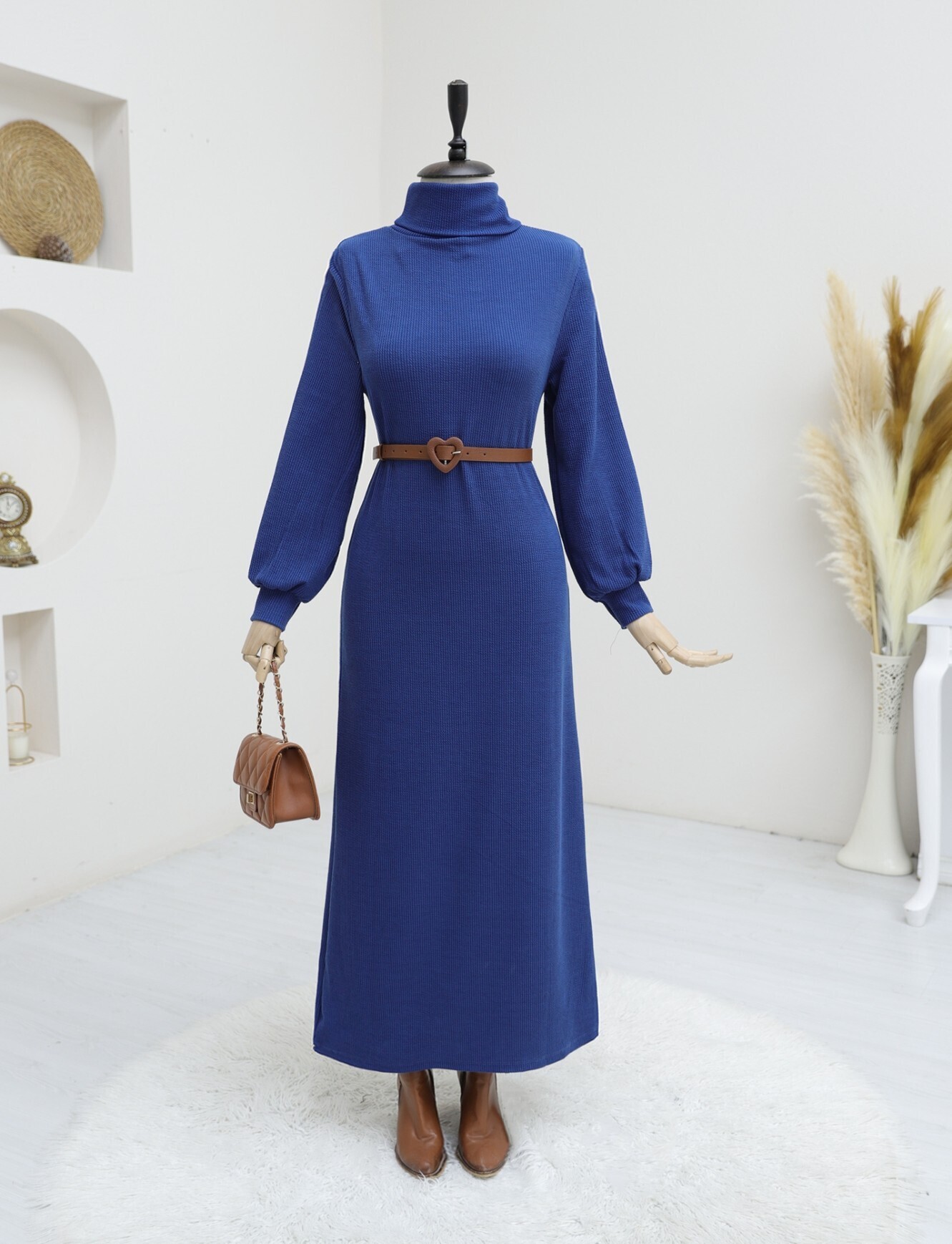Boğazlı Fitilli Elbise -İndigo-İndigo