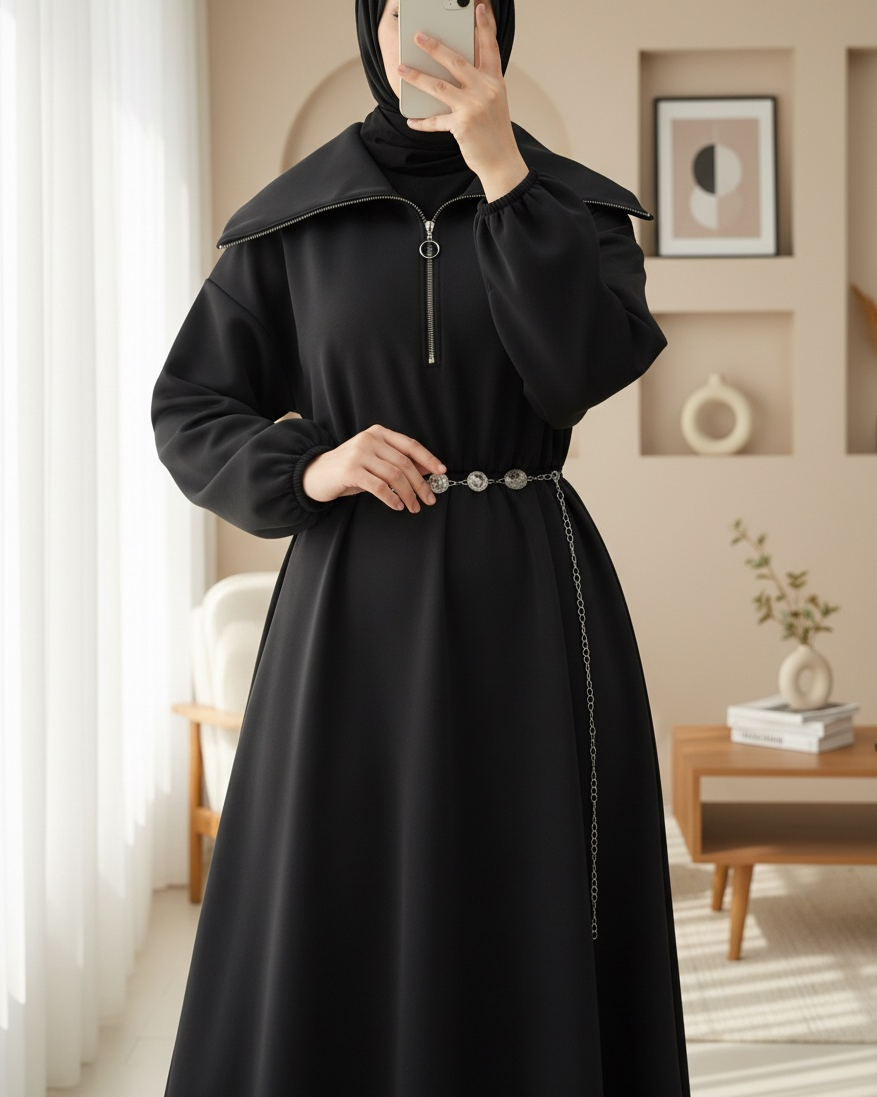 Boğazlı Yarım Fermuarlı Beli Büzgülü Kemerli Scuba Elbise -Siyah-siyah