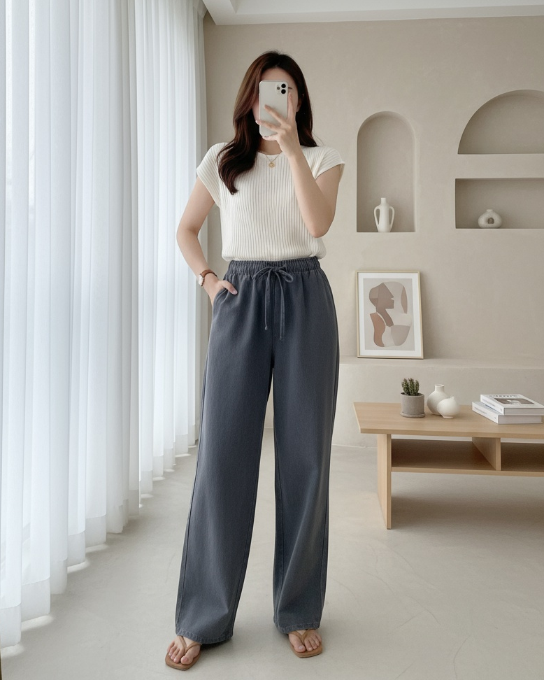 Bol Paça Beli Lastikli Bağcık Detaylı Kot Pantolon -Antrasit-Antrasit