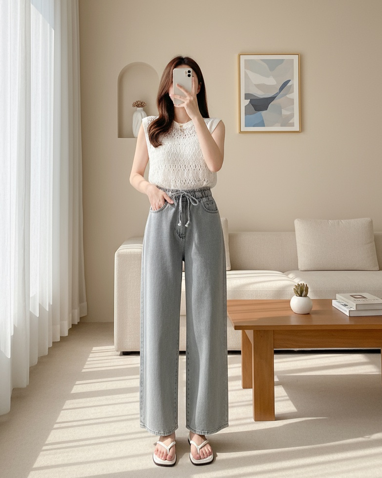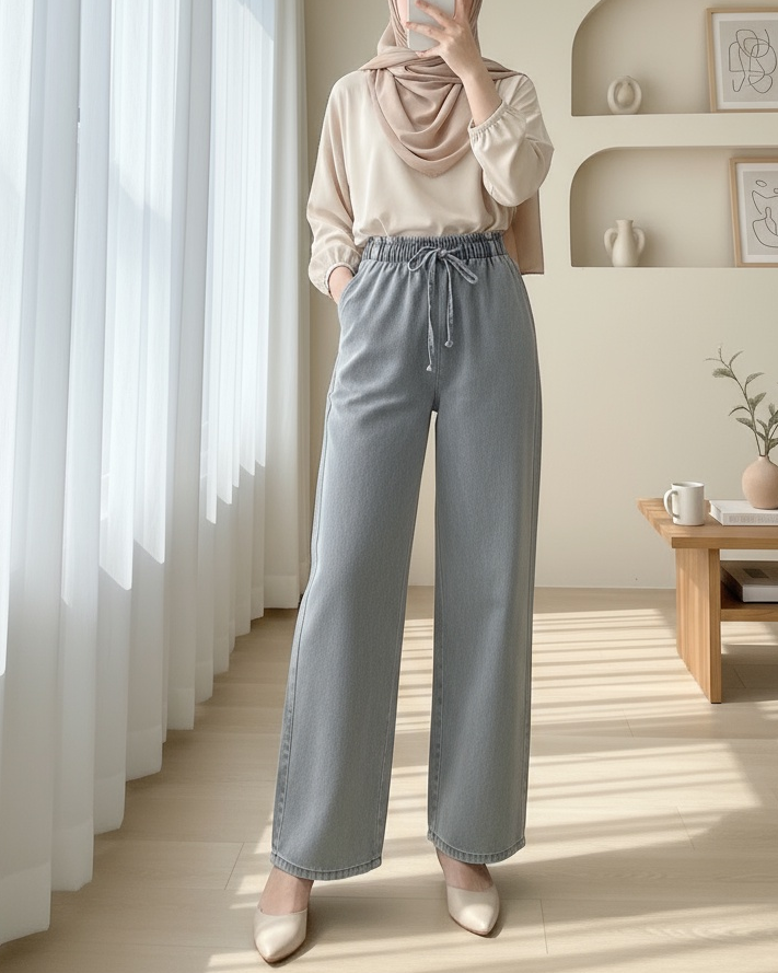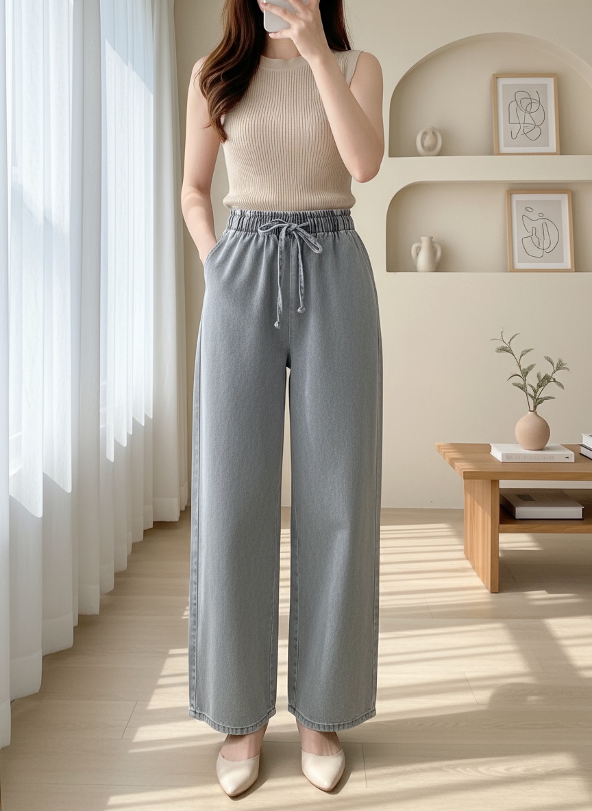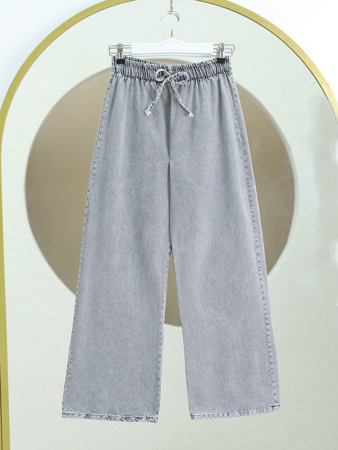 Bol Paça Beli Lastikli Bağcık Detaylı Kot Pantolon -Gri-Gri