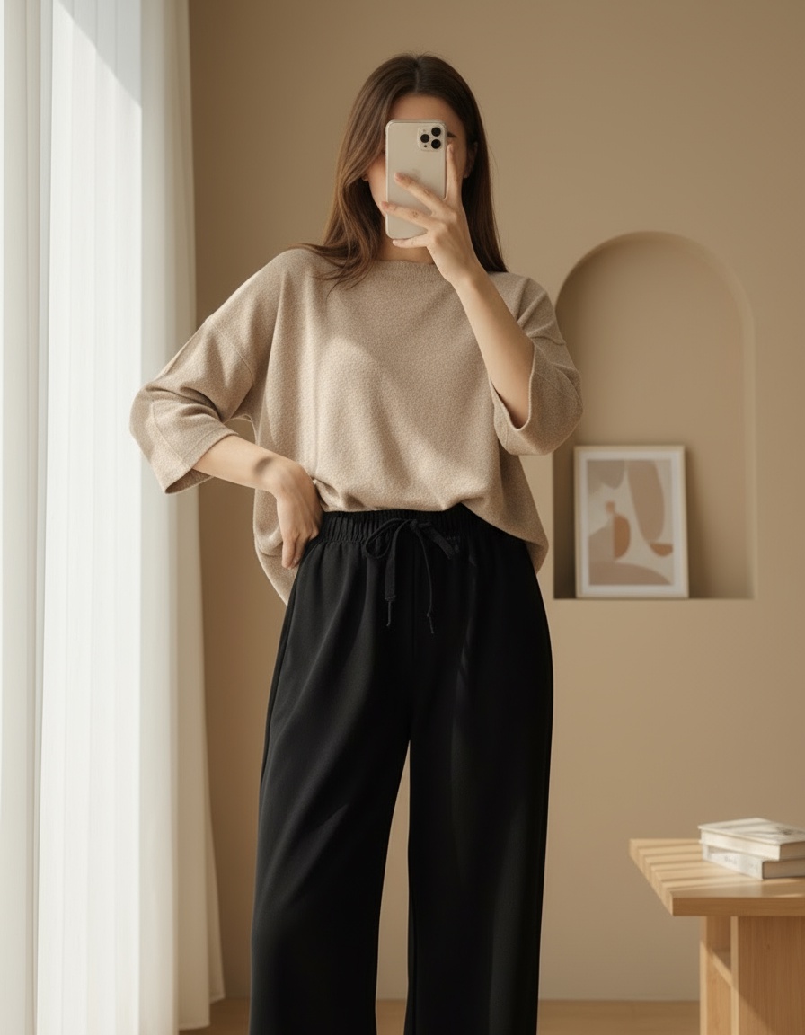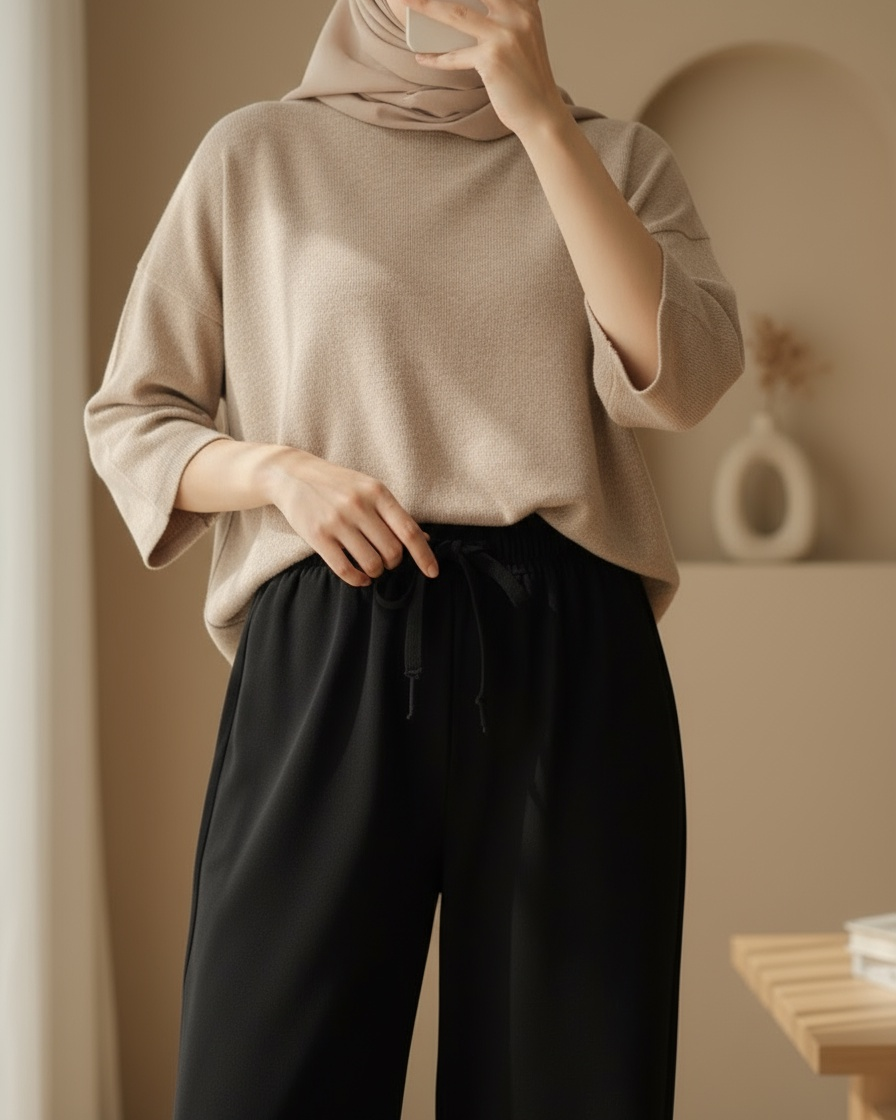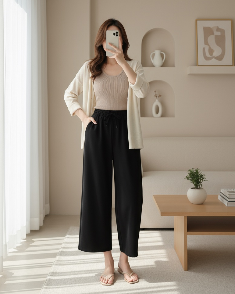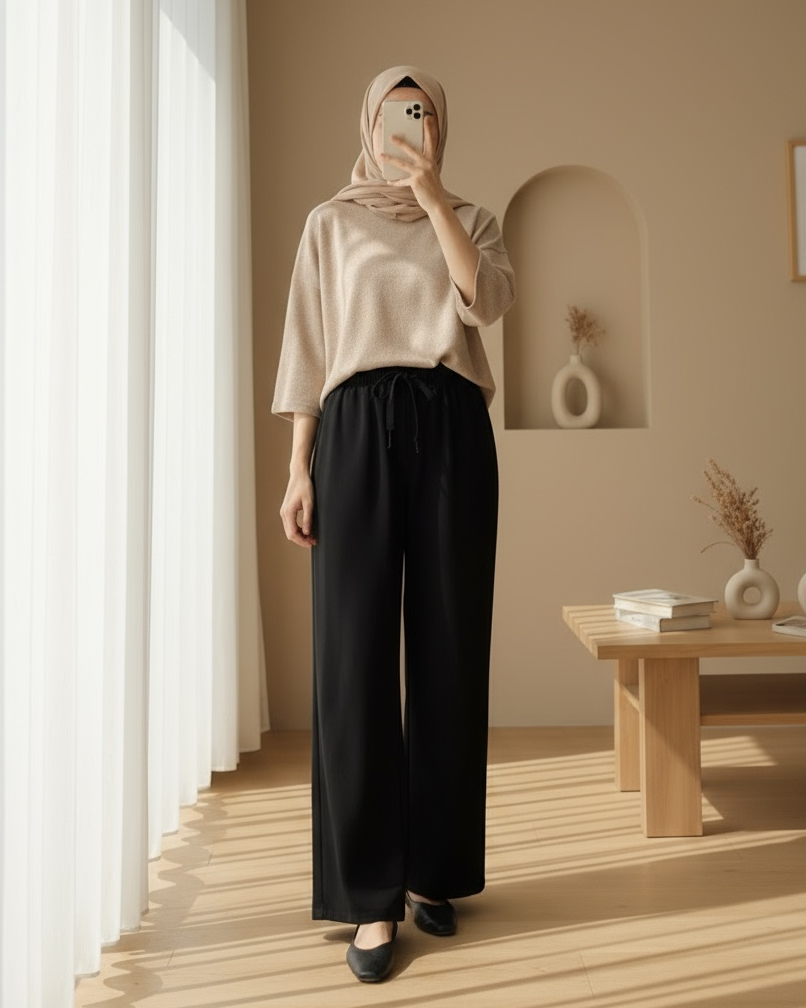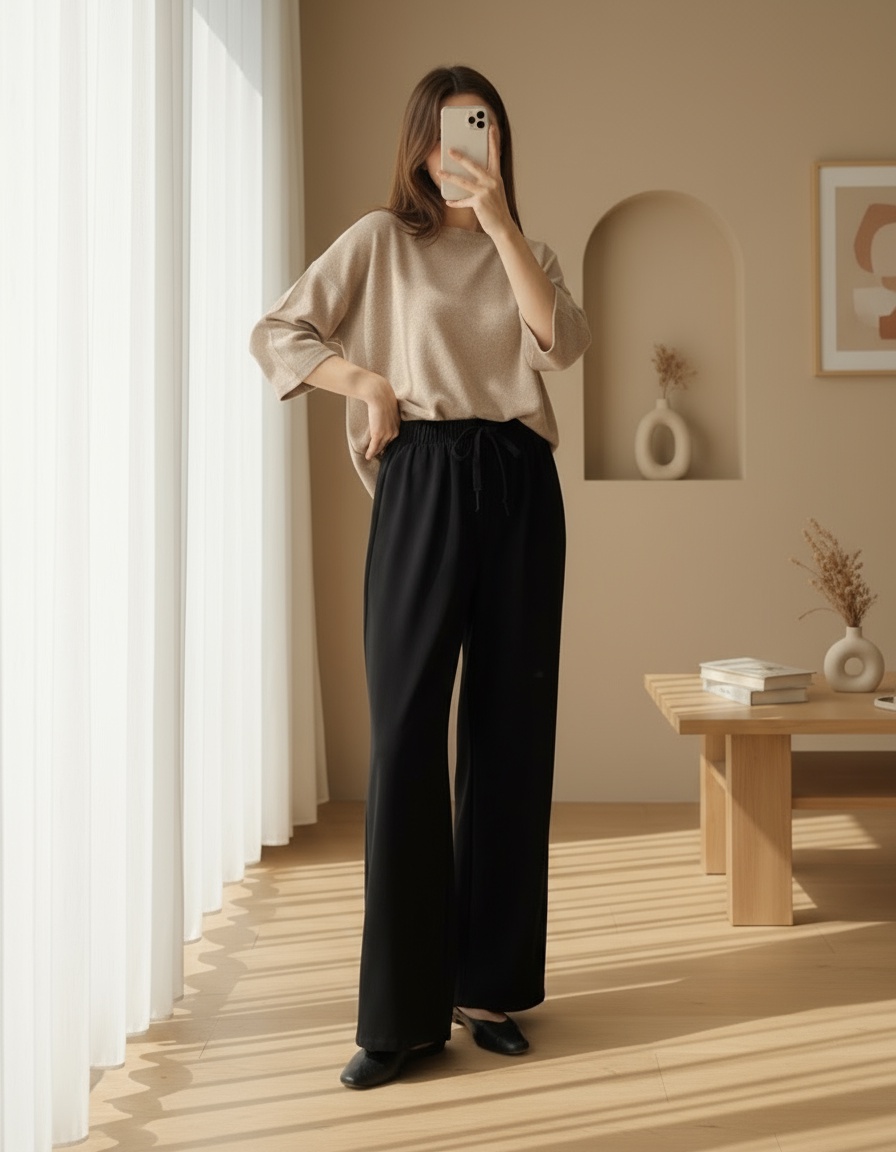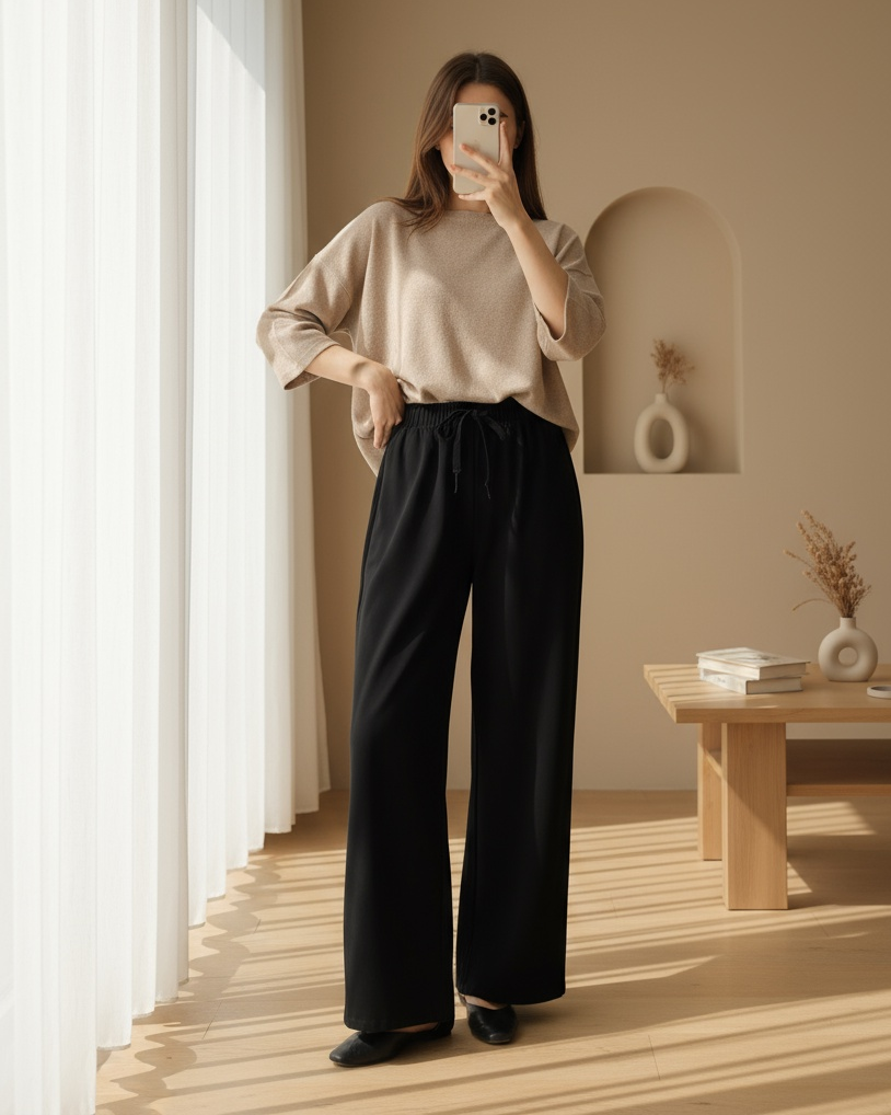 Bol Paça Beli Lastikli Bağcık Detaylı Kot Pantolon -Siyah-Siyah