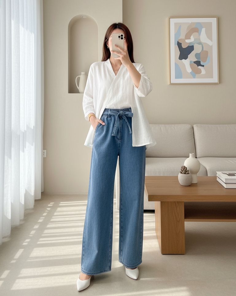 Bol Paça Beli Lastikli Kuşaklı Kot Pantolon -Buz Mavi-Buz Mavi