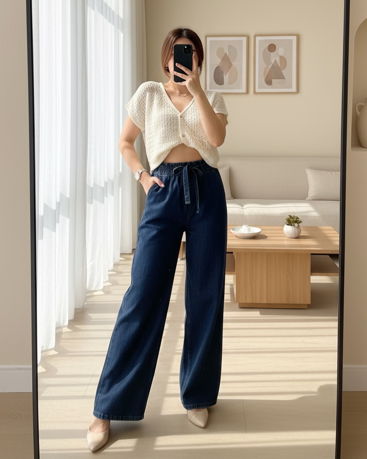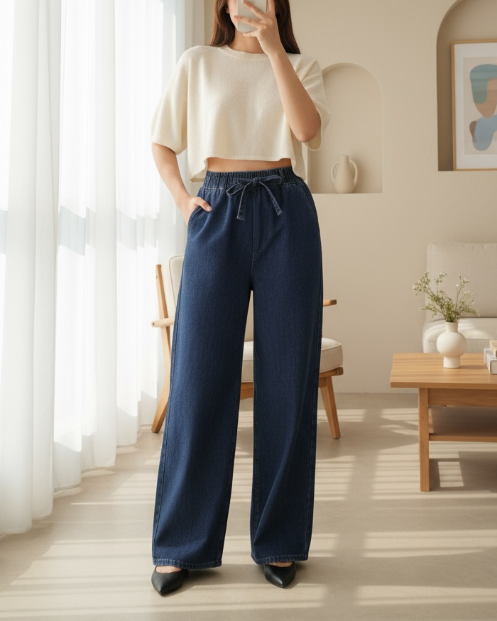 Bol Paça Beli Lastikli Kuşaklı Kot Pantolon -İndigo-İndigo