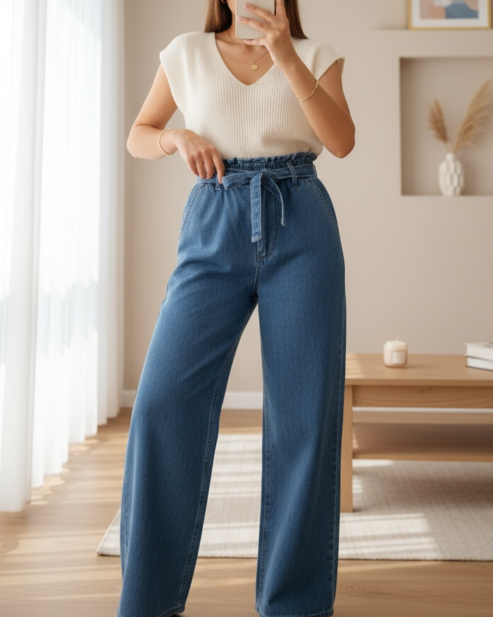 Bol Paça Beli Lastikli Kuşaklı Kot Pantolon -Koyu Mavi-Koyu Mavi